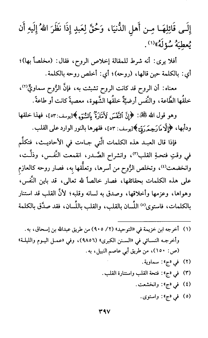 فإذا قال العبد هذه الكلمات التي جاءت في الأحاديث، فتكلم في وقت فتحة القلب، وانشراح الصدر، انقمعت النفس، وذلت، وانخضعت، وتخلص الروح من أسرها، وتعلقها به فصار روحه كالعازم على هذه الكلمات بحقائقها، فصار خالصاً لله تعالى، قد باين النفس، وهواها، وعزمها وأخلاقها، وصدق به لسانه وقلبه؛ لأن القلب قد استنار بالكلمات، فاستوى اللسان بالقلب، والقلب باللسان، فقد صدق بالكلمة