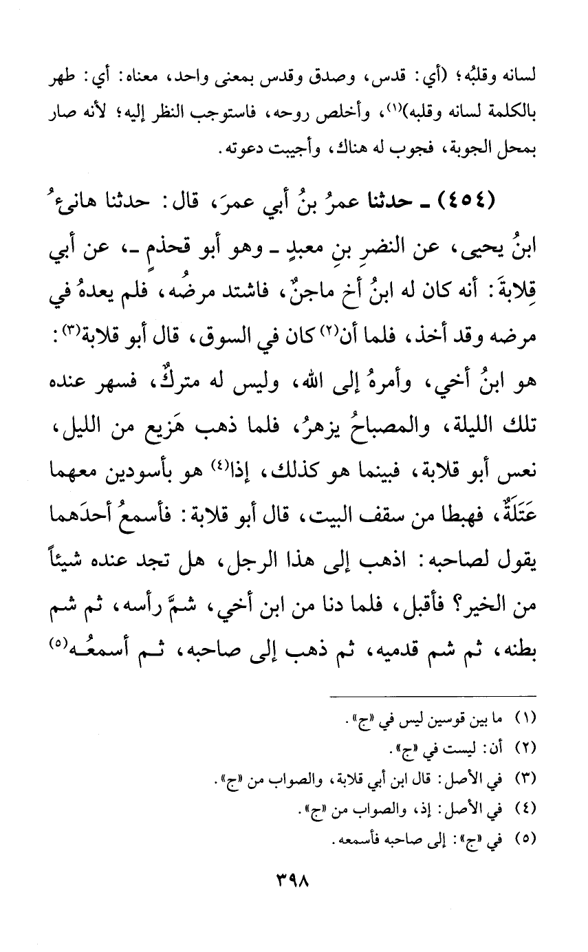 454 - حدثنا عمر بن أبي عمر، قال: حدثنا هانئ ابن يحيى، عن النضر بن معبدٍ -وهو أبو قحذمٍ-، عن أبي قلابة: أنه كان له ابن أخ ماجنٌ، فاشتد مرضه، فلم يعده في مرضه وقد أخذ، فلما أن كان في السوق، قال أبو قلابة: هو ابن أخي، وأمره إلى الله، وليس له متركٌ، فسهر عنده تلك الليلة، والمصباح يزهر، فلما ذهب هزيع من الليل، نعس أبو قلابة، فبينما هو كذلك، إذا هو بأسودين معهما عتلةٌ، فهبطا من سقف البيت، قال أبو قلابة: فأسمع أحدهما يقول لصاحبه: اذهب إلى هذا الرجل، هل تجد عنده شيئاً من الخير؟ فأقبل، فلما دنا من ابن أخي، شم رأسه، ثم شم بطنه، ثم شم قدميه، ثم ذهب إلى صاحبه، ثم أسمعه