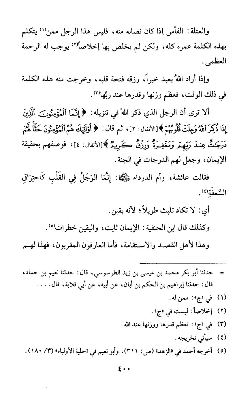 ألا ترى أن الرجل الذي ذكر الله في تنزيله: {إنما المؤمنون الذين إذا ذكر الله وجلت قلوبهم}، ثم قال: {أولئك هم المؤمنون حقاً لهم درجاتٌ عند ربهم ومغفرةٌ وزرقٌ كريمٌ}، فوصفهم بحقيقة الإيمان، وجعل لهم الدرجات في الجنة.