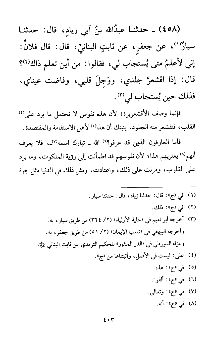 458 - حدثنا عبد الله بن أبي زيادٍ، قال: حدثنا سيارٌ، عن جعفرٍ، عن ثابتٍ البناني، قال: قال فلانٌ: إني لأعلم متى يستجاب لي، فقالوا: من أين تعلم ذاك؟ قال: إذا اقشعر جلدي، ووجل قلبي، وفاضت عيناي، فذلك حين يستجاب لي.