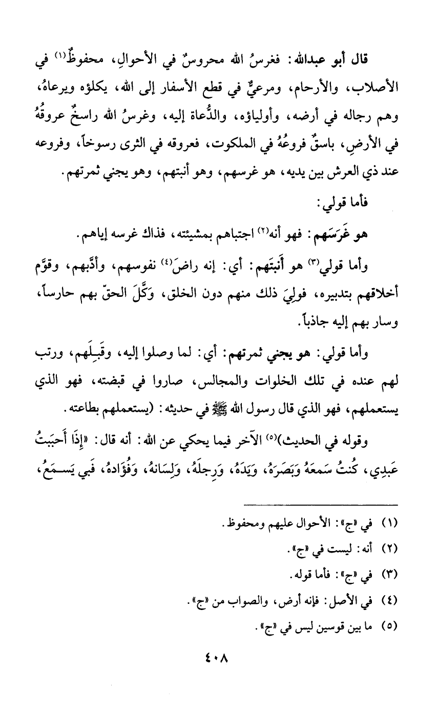 قال أبو عبد الله: فغرس الله محروسٌ في الأحوال، محفوظٌ في الأصلاب، والأرحام، ومرعيٌّ في قطع الأسفار إلى الله، يكلؤه ويرعاه، وهم رجاله في أرضه، وأولياؤه، والدعاة إليه، وغرس الله راسخٌ عروقه في الأرض، باسقٌ فروعه في الملكوت، فعروقه في الثرى رسوخاً، وفروعه عند ذي العرش بين يديه، هو غرسهم، وهو أنبتهم، وهو يجني ثمرتهم.
