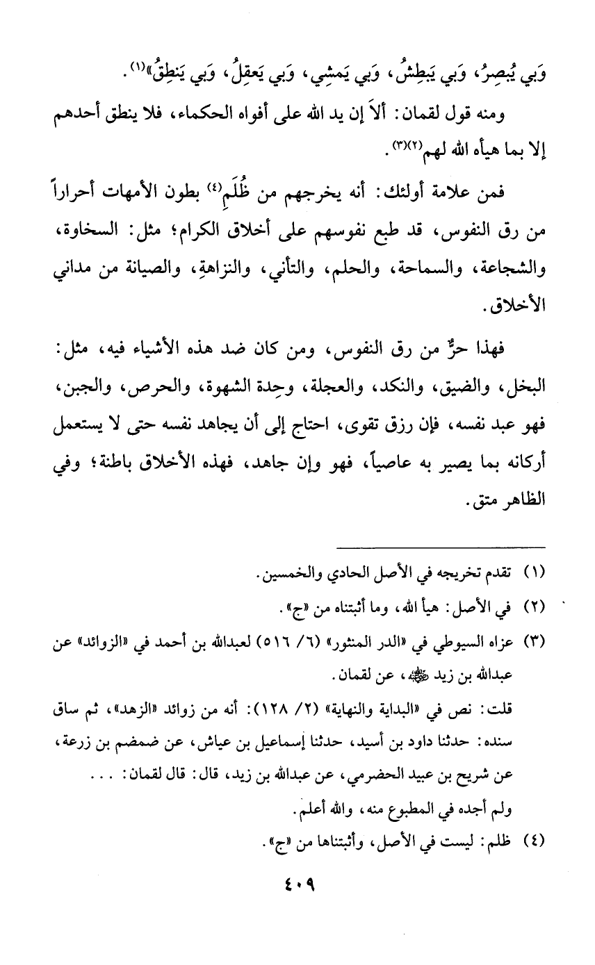 فهذا حرٌّ من رق النفوس، ومن كل ضد هذه الأشياء فيه، مثل: البخل، والضيق، والنكد، والعجلة، وحدة الشهوة، والحرص، والجبن، فهو عبد نفسه، فإن رزق تقوى، احتاج إلى أن يجاهد نفسه حتى لا يستعمل أركانه بما يصير به عاصياً، فهو وإن جاهد، فهذه الأخلاق باطنة؛ وفي الظاهر متق.