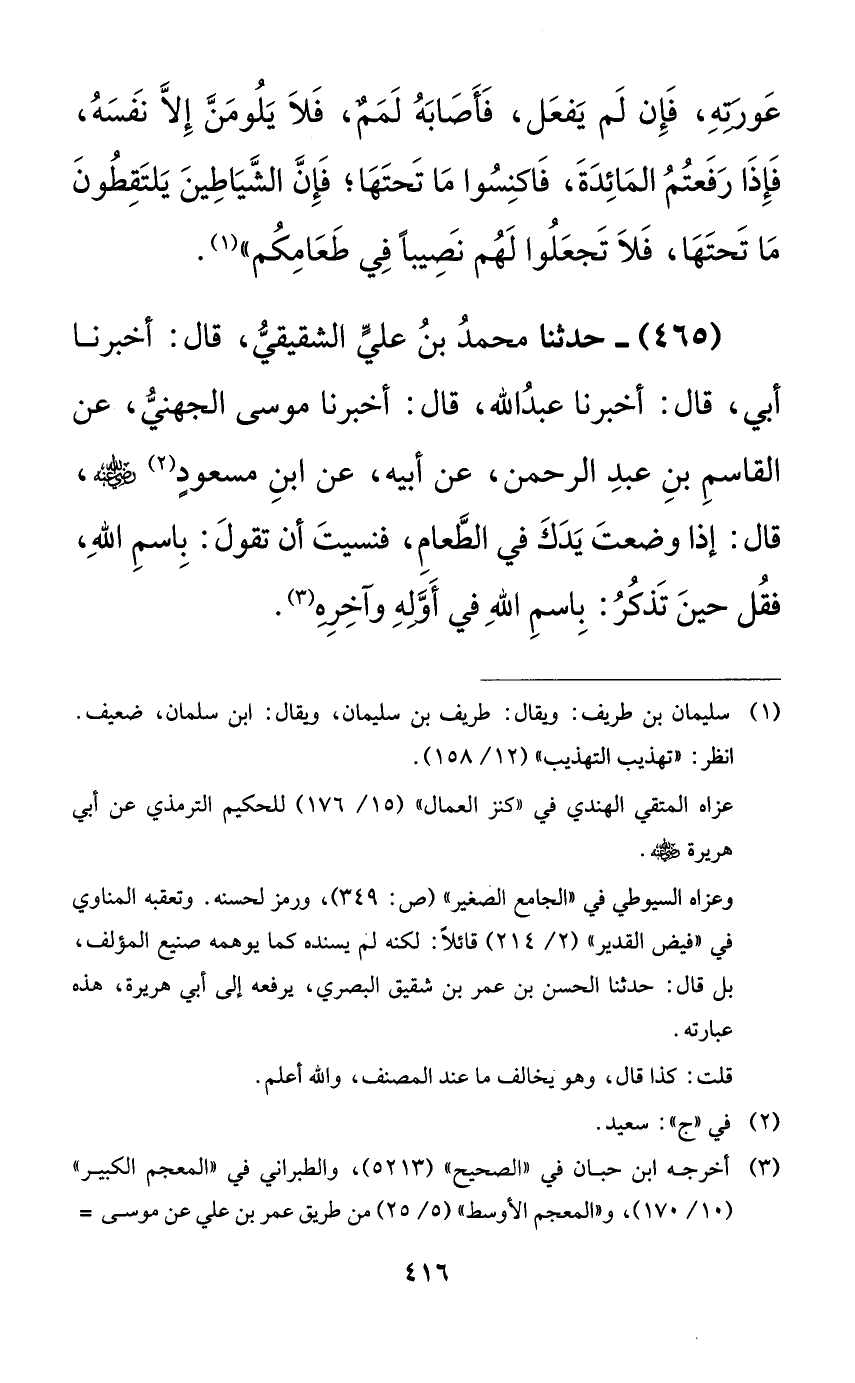 465 - حدثنا محمد بن علي الشقيقي، قال: أخبرنا أبي، قال: أخبرنا عبد الله، قال: أخبرنا موسى الجهني، عن القاسم بن عبد الرحمن، عن أبيه، عن ابن مسعودٍ رضي الله عنه، قال: إذا وضعت يدك في الطعام، فنسيت أن تقول: باسم الله، فقل حين تذكر: باسم الله في أوله وآخره.