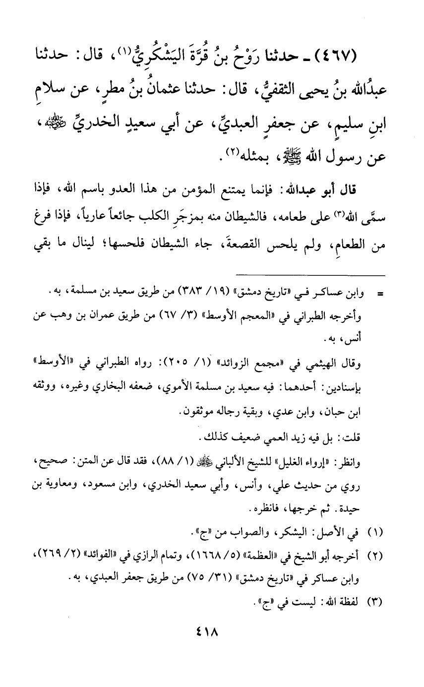 467 - حدثنا روح بن قرة اليشكري، قال: حدثنا عبد الله بن يحيى الثقفي، قال: حدثنا عثمان بن مطرٍ، عن سلام ابن سليمٍ، عن جعفرٍ العبدي، عن أبي سعيدٍ الخدري رضي الله عنه، عن رسول الله صلى الله عليه وسلم، بمثله.