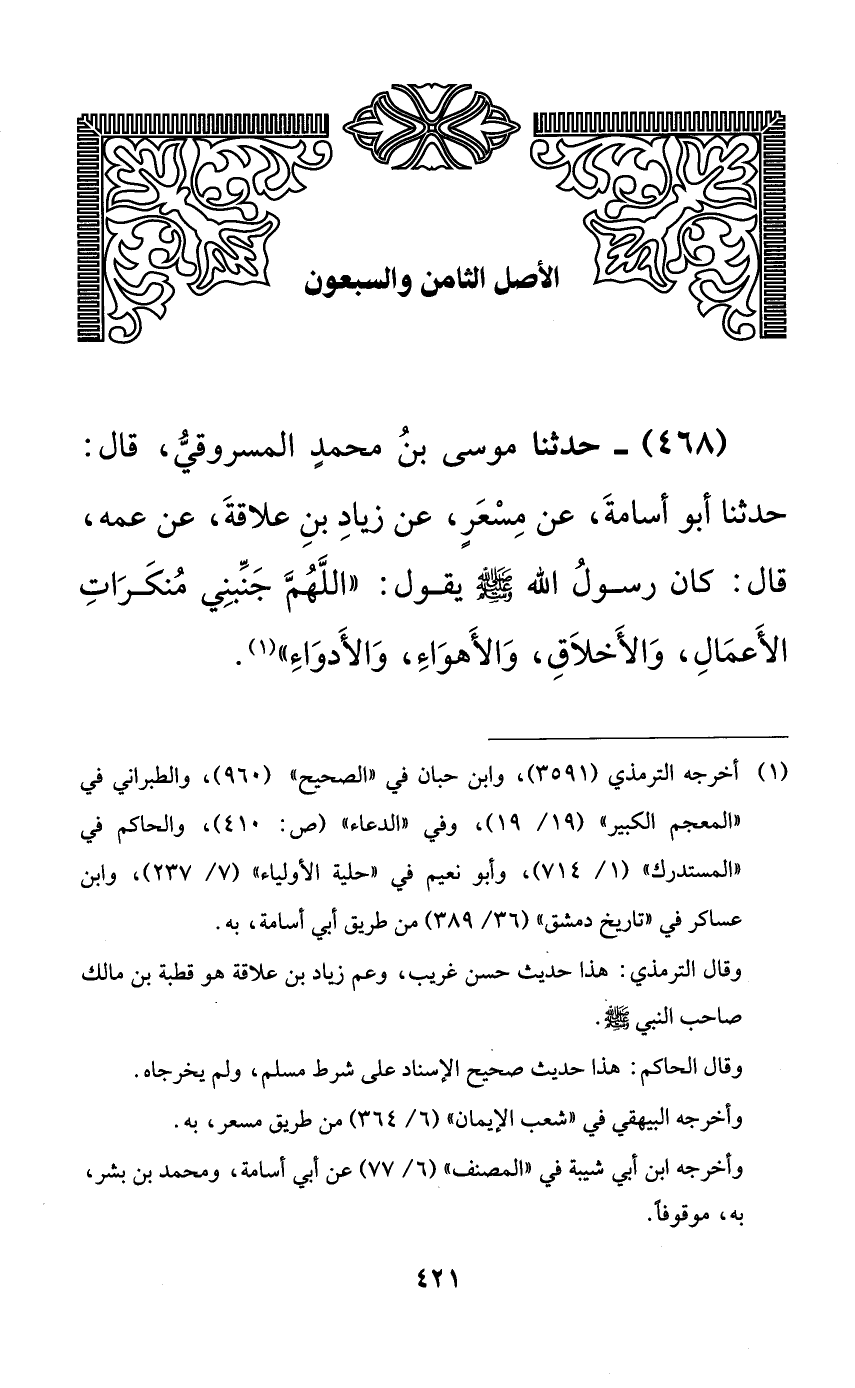 468 - حدثنا موسى بن محمدٍ المسروقي، قال: حدثنا أبو أسامة، عن مسعرٍ، عن زياد بن علاقة، عن عمه، قال: كان رسول الله صلى الله عليه وسلم يقول: ((اللهم جنبني منكرات الأعمال، والأخلاق، والأهواء، والأدواء)).