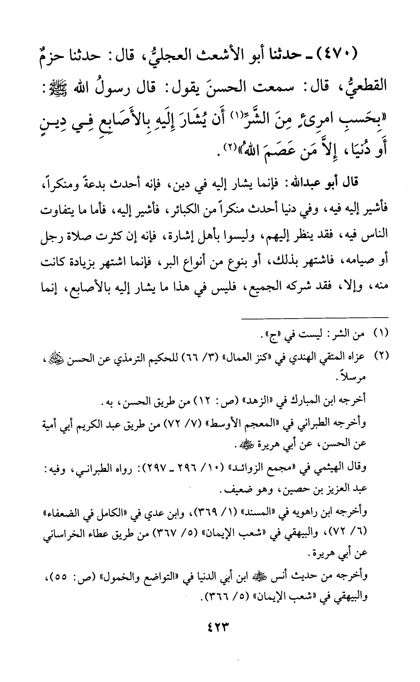 470 - حدثنا أبو الأشعث العجلي، قال: حدثنا حزمٌ القطعي، قال: سمعت الحسن يقول: قال رسول الله صلى الله عليه وسلم: ((بحسب امرئٍ من الشر أن يشار إليه بالأصابع في دين أو دنيا، إلا من عصم الله)).
