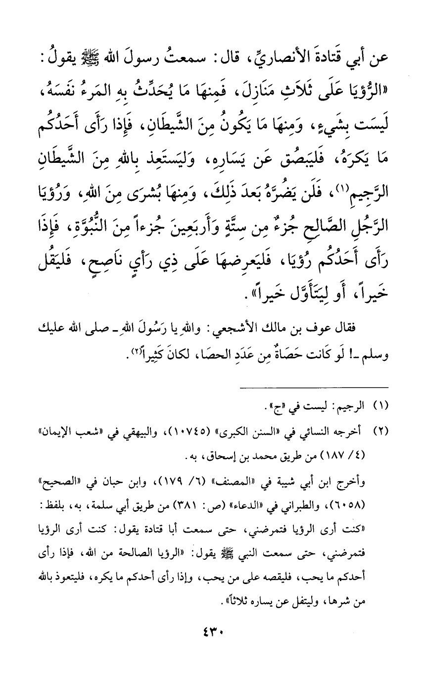 عن أبي قتادة الأنصاري، قال: سمعت رسول الله صلى الله عليه وسلم يقول: ((الرؤيا على ثلاث منازل، فمنها ما يحدث به المرء نفسه، ليست بشيءٍ، ومنها ما يكون من الشيطان، فإذا رأى أحدكم ما يكره، فليبصق عن يساره، وليستعذ بالله من الشيطان الرجيم، فلن يضره بعد ذلك، ومنها بشرى من الله، ورؤيا الرجل الصالح جزءٌ من ستةٍ وأربعين جزءاً من النبوة، فإذا رأى أحدكم رؤيا، فليعرضها على ذي رأيٍ ناصحٍ، فليقل خيراً، أو ليتأول خيراً)).