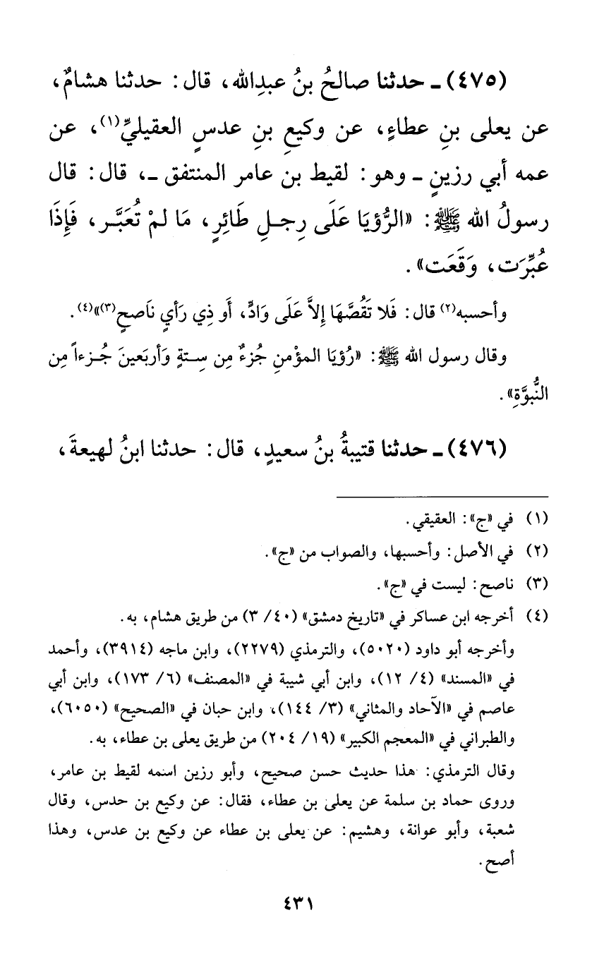 475 - حدثنا صالح بن عبد الله، قال: حدثنا هشامٌ، عن يعلى بن عطاءٍ، عن وكيع بن عدسٍ العقيلي، عن عمه أبي رزينٍ -وهو: لقيط بن عامر المنتفق-، قال: قال رسول الله صلى الله عليه وسلم: ((الرؤيا على رجل طائرٍ، ما لم تعبر، فإذا عبرت، وقعت)).