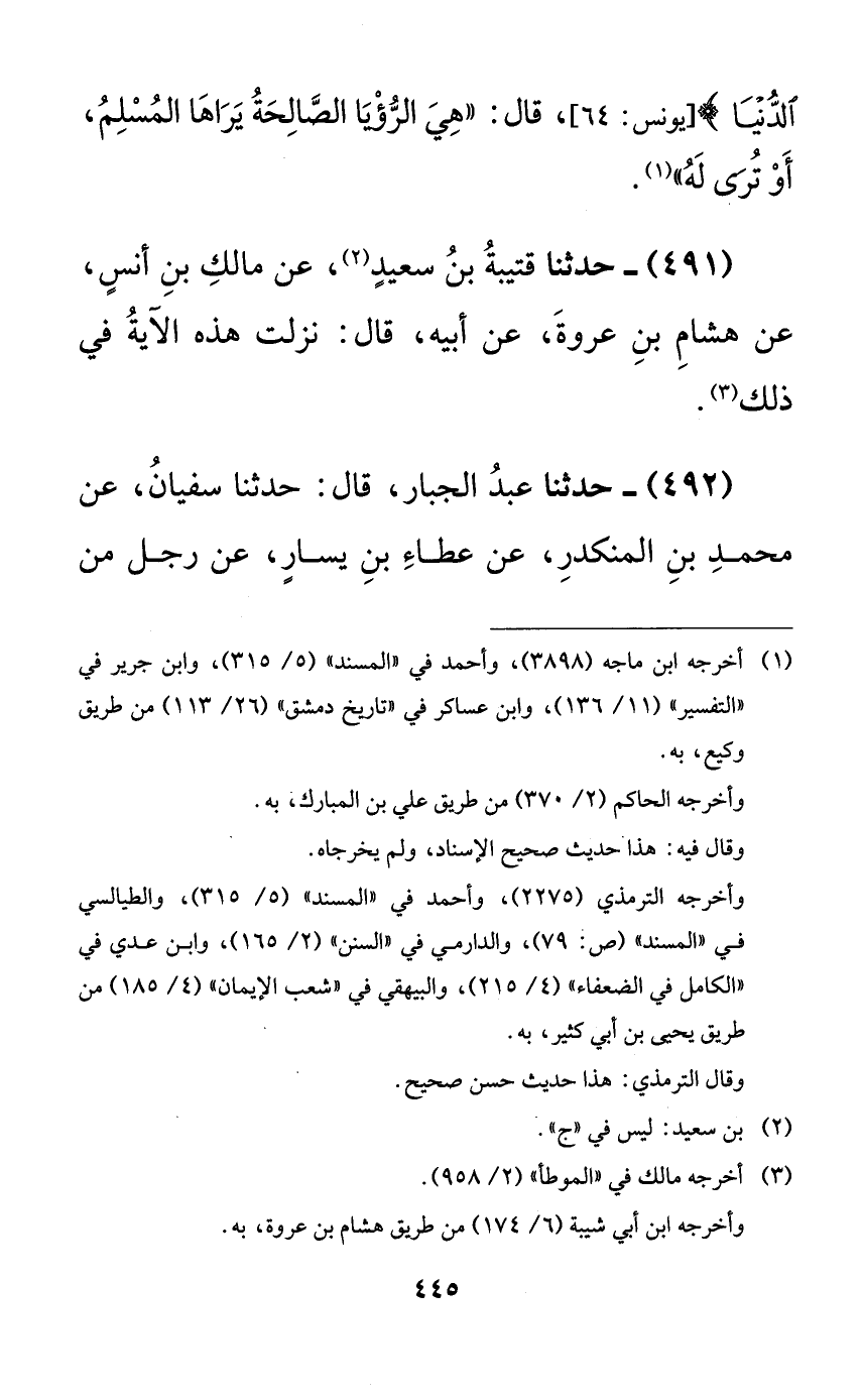 491 - حدثنا قتيبة بن سعيدٍ، عن مالك بن أنسٍ، عن هشام بن عروة، عن أبيه، قال: نزلت هذه الآية في ذلك.