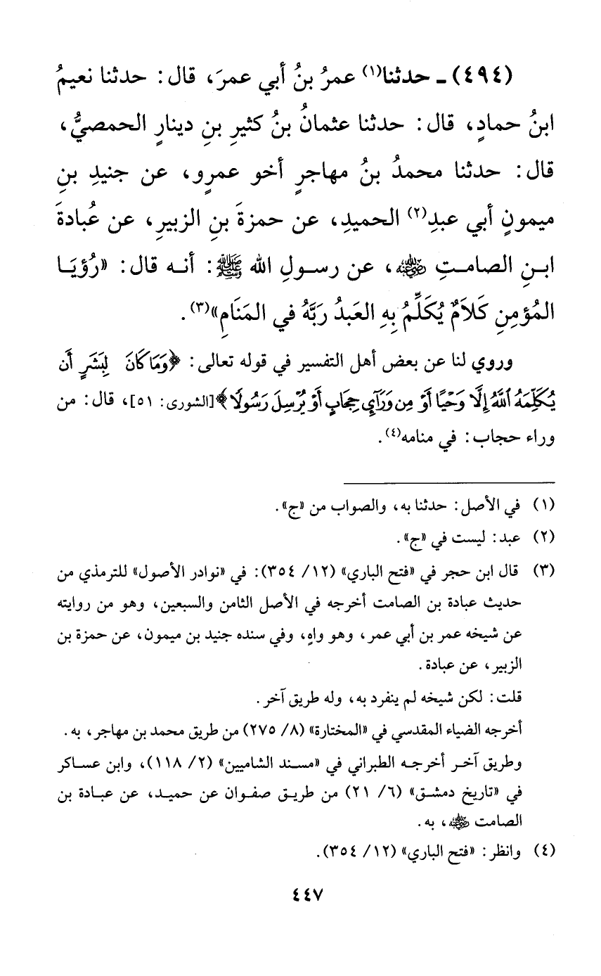 494 - حدثنا عمر بن أبي عمر، قال: حدثنا نعيم ابن حمادٍ، قال: حدثنا عثمان بن كثير بن دينارٍ الحمصي، قال: حدثنا محمد بن مهاجرٍ أخو عمرٍو، عن جنيد بن ميمونٍ أبي عبد الحميد، عن حمزة بن الزبير، عن عبادة ابن الصامت رضي الله عنه، عن رسول الله صلى الله عليه وسلم: أنه قال: ((رؤيا المؤمن كلامٌ يكلم به العبد ربه في المنام)).