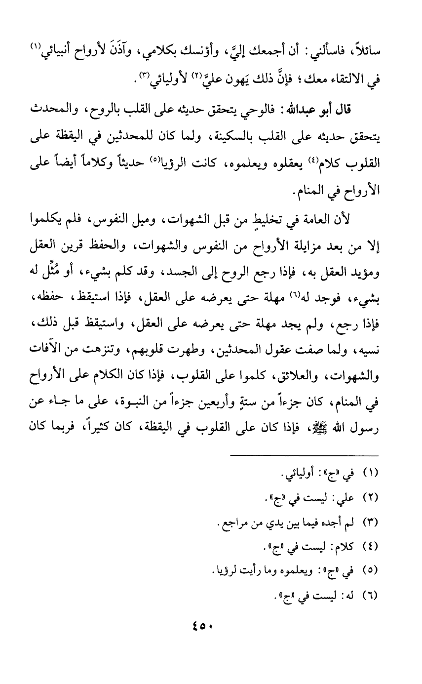 قال أبو عبد الله: فالوحي يتحقق حديثه على القلب بالروح، والمحدث يتحقق حديثه على القلب بالسكينة، ولما كان للمحدثين في اليقظة على القلوب كلام يعقلوه ويعلموه، كانت الرؤيا حديثاً وكلاماً أيضاً على الأرواح في المنام.