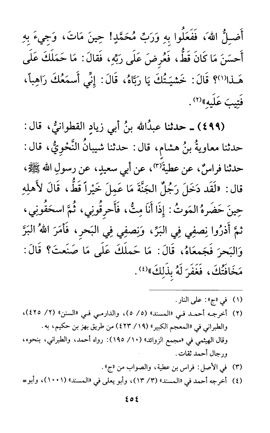 499 - حدثنا عبد الله بن أبي زيادٍ القطواني، قال: حدثنا معاوية بن هشامٍ، قال: حدثنا شيبان النحوي، قال: حدثنا فراسٌ، عن عطية عن أبي سعيدٍ، عن رسول الله صلى الله عليه وسلم: قال: ((لقد دخل رجلٌ الجنة ما عمل خيراً قط، قال لأهله حين حضره الموت: إذا أنا مت، فأحرقوني، ثم اسحقوني، ثم أذروا نصفي في البر، ونصفي في البحر، فأمر الله البر والبحر فجمعاه، قال: ما حملك على ما صنعت؟ قال: مخافتك، فغفر له بذلك)).