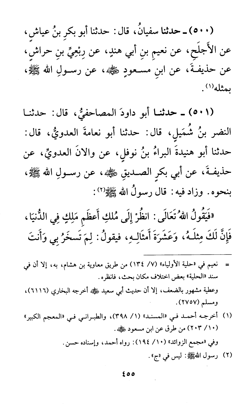 500 - حدثنا سفيان، قال: حدثنا أبو بكر بن عياشٍ، عن الأجلح، عن نعيم بن أبي هندٍ، عن ربعي بن حراشٍ، عن حذيفة، عن ابن مسعودٍ رضي الله عنه، عن رسول الله صلى الله عليه وسلم، بمثله.