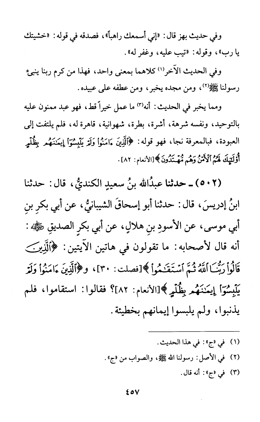 502 - حدثنا عبد الله بن سعيد الكندي، قال: حدثنا ابن إدريس، قال: حدثنا أبو إسحاق الشيباني، عن أبي بكر بن أبي موسى، عن الأسود بن هلالٍ، عن أبي بكرٍ الصديق رضي الله عنه: أنه قال لأصحابه: ما تقولون في هاتين الآيتين: {الذين قالوا ربنا الله ثم استقاموا}، و {الذين آمنوا ولم يلبسوا إيمانهم بظلمٍ}؟ فقالوا: استقاموا، فلم يذنبوا، ولم يلبسوا إيمانهم بخطيئة.