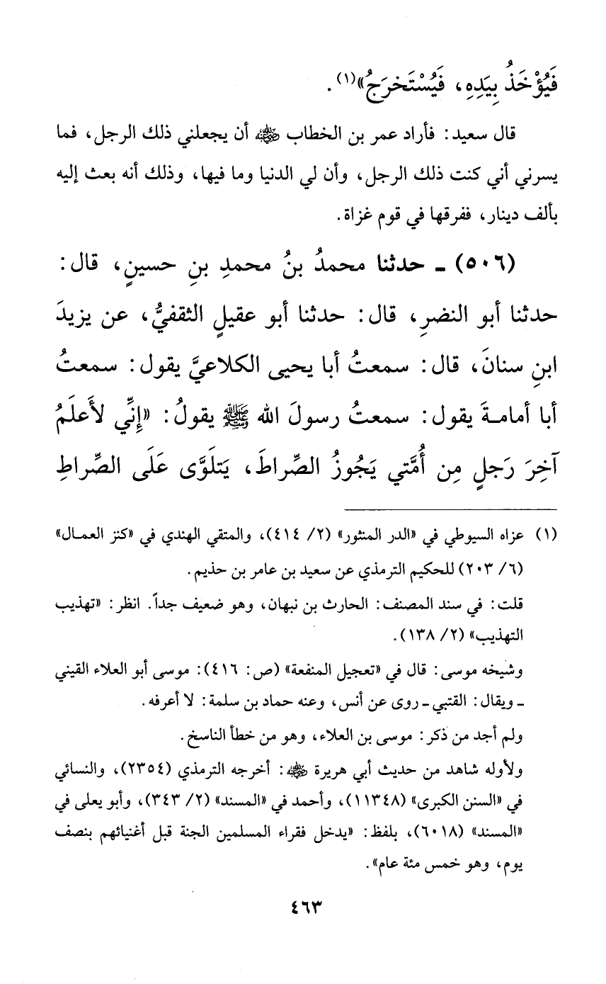 506 - حدثنا محمد بن محمد بن حسينٍ، قال: حدثنا أبو النضر، قال: حدثنا أبو عقيلٍ الثقفي، عن يزيد ابن سنان، قال: سمعت أبا يحيى الكلاعي يقول: سمعت أبا أمامة يقول: سمعت رسول الله صلى الله عليه وسلم يقول: ((إني لأعلم آخر رجلٍ من أمتي يجوز الصراط، يتلوى على الصراط