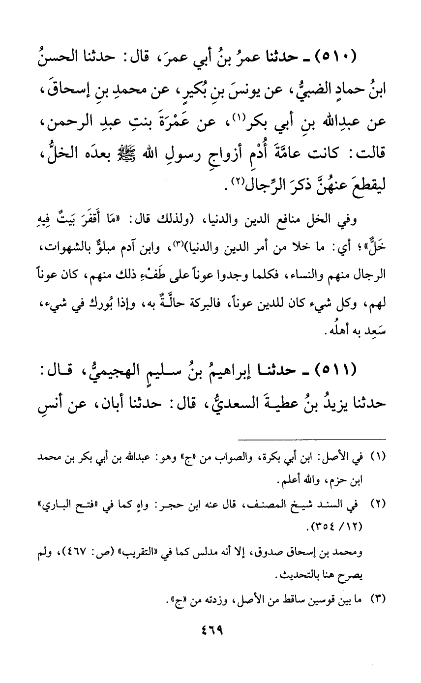 510 - حدثنا عمر بن أبي عمر، قال: حدثنا الحسن ابن حمادٍ الضبي، عن يونس بن بكيرٍ، عن محمد بن إسحاق، عن عبد الله بن أبي بكر، عن عمرة بنت عبد الرحمن، قالت: كانت عامة أدم أزواج رسول الله صلى الله عليه وسلم بعده الخل، ليقطع عنهن ذكر الرجال.