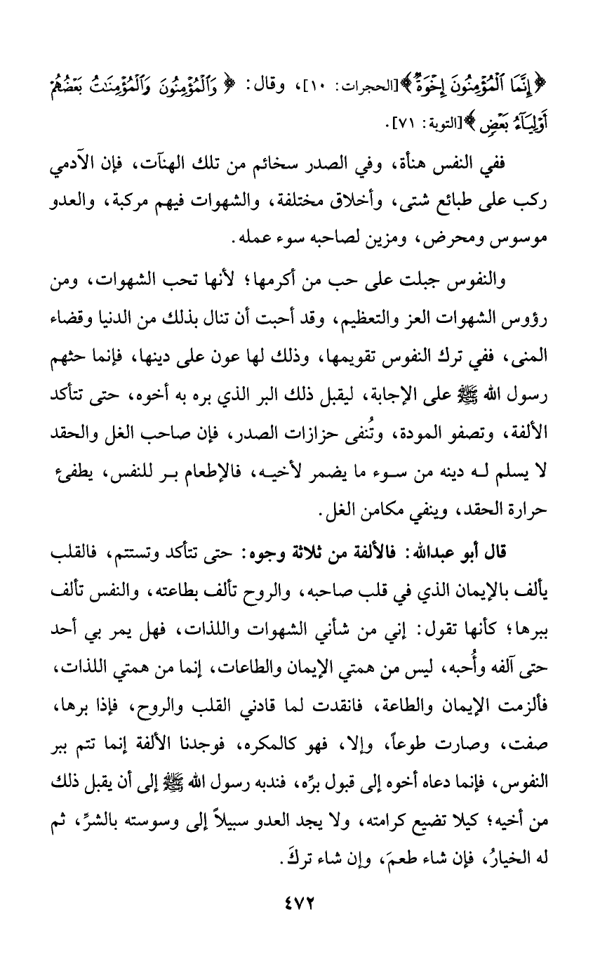 قال أبو عبد الله: فالألفة من ثلاثة وجوه: حتى تتأكد وتستتم، فالقلب يألف بالإيمان الذي في قلب صاحبه، والروح تألف بطاعته، والنفس تألف ببرها؛ كأنها تقول: إني من شأني الشهوات واللذات، فهل يمر بي أحد حتى آلفه وأحبه، ليس من همتي الإيمان والطاعات، إنما من همتي اللذات، فألزمت الإيمان والطاعة، فانقدت لما قادني القلب والروح، فإذا برها، صفت، وصارت طوعاً، وإلا، فهو كالمكره، فوجدنا الألفة إنما تتم ببر النفوس، فإنما دعاه أخوه إلى قبول بره، فندبه رسول الله صلى الله عليه وسلم إلى أن يقبل ذلك من أخيه، كيلا تضيع كرامته، ولا يجد العدو سبيلاً إلى وسوسته بالشر، ثم له الخيار، فإن شاء طعم، وإن شاء ترك.