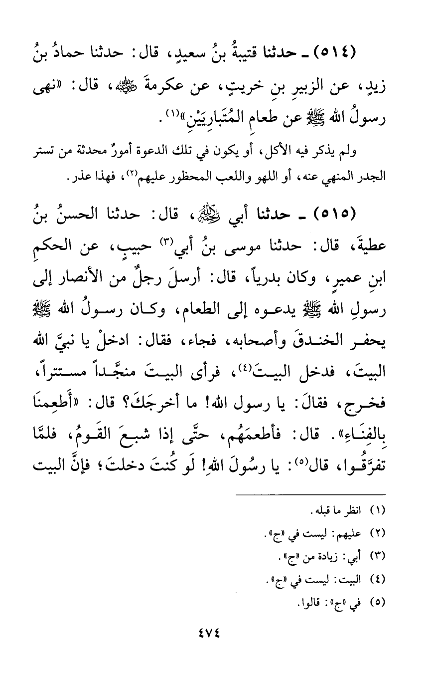 514 - حدثنا قتيبة بن سعيدٍ، قال: حدثنا حماد بن زيدٍ، عن الزبير بن خريتٍ، عن عكرمة رضي الله عنه، قال: ((نهى رسول الله صلى الله عليه وسلم عن طعام المتباريين)).
