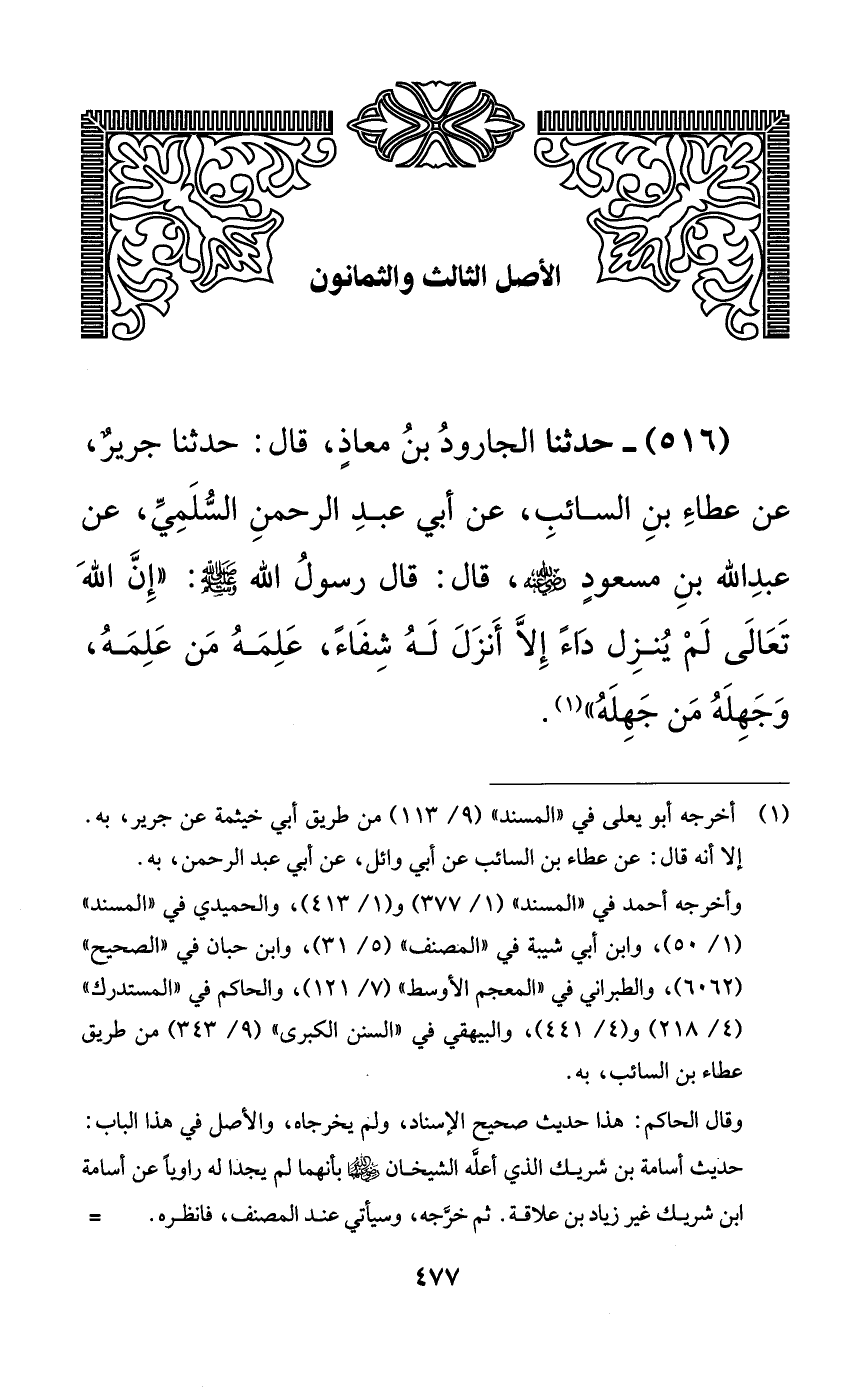 516 - حدثنا الجارود بن معاذٍ، قال: حدثنا جريرٌ، عن عطاء بن السائب، عن أبي عبد الرحمن السلمي، عن عبد الله بن مسعودٍ رضي الله عنه، قال: قال رسول الله صلى الله عليه وسلم: ((إن الله تعالى لم ينزل داءً إلا أنزل له شفاءً، علمه من علمه، وجهله من جهله)).