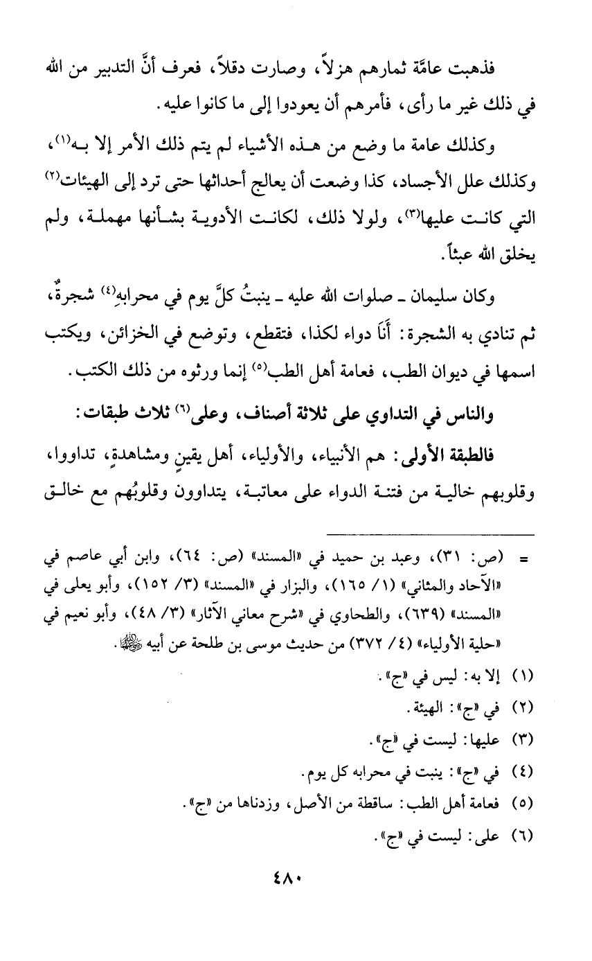 فالطبقة الأولى: هم الأنبياء، والأولياء، أهل يقينٍ ومشاهدةٍ، تداووا، وقلوبهم خالية من فتنة الدواء على معاتبة، يتداوون وقلوبهم مع خالق