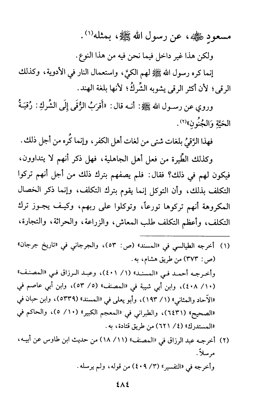 وكذلك الطيرة من فعل أهل الجاهلية، فهل ذكر أنهم لا يتداوون، فيكون لهم في ذلك؟ فقال: فلم يصفهم بترك ذلك من أجل أنهم تركوا التكلف بذلك، وأن التوكل إنما يقوم بترك التكلف، وإنما ذكر الخصال المكروهة أنهم تركوها تورعاً، وتوكلوا على ربهم، وكيف يجوز ترك التكلف، وأعظم التكلف طلب المعاش، والزراعة، والحراثة، والتجارة،