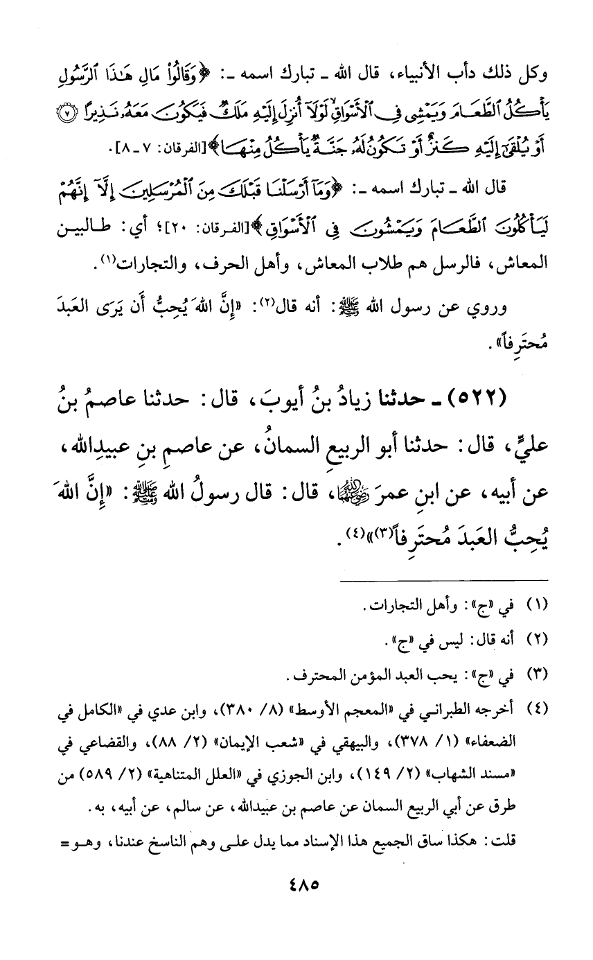 522 - حدثنا زياد بن أيوب، قال: حدثنا عاصم بن علي، قال: حدثنا أبو الربيع السمان، عن عاصم بن عبيد الله، عن أبيه، عن ابن عمر رضي الله عنهما، قال: قال رسول الله صلى الله عليه وسلم: ((إن الله يحب العبد محترفاً)).