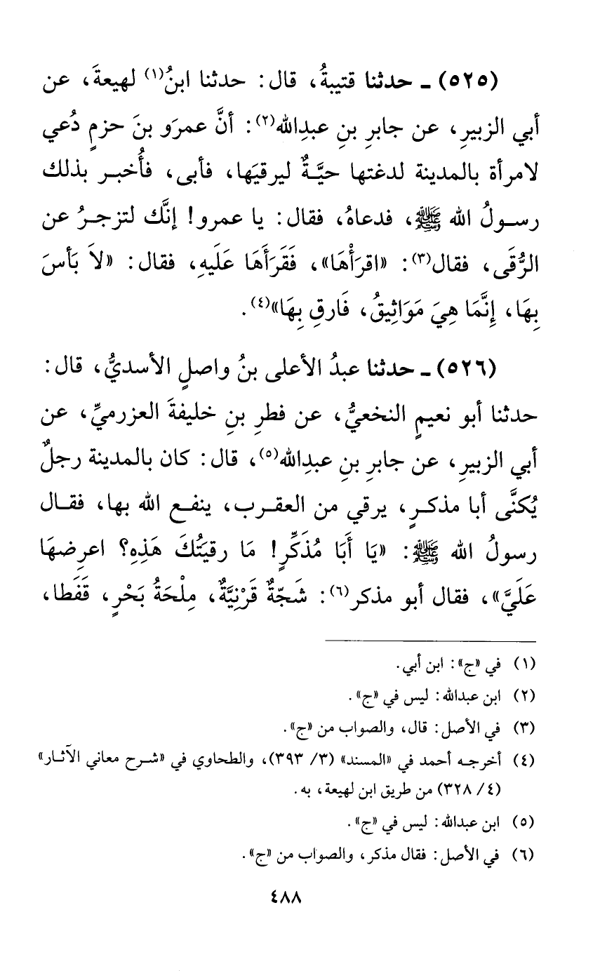 525 - حدثنا قتيبة، قال: حدثنا ابن لهيعة، عن أبي الزبير، عن جابر بن عبد الله: أن عمرو بن حزمٍ دعي لامرأة بالمدينة لدغتها حيةٌ ليرقيها، فأبى، فأخبر ذلك رسول الله صلى الله عليه وسلم، فدعاه، فقال: يا عمرو! إنك لتزجر عن الرقى، فقال: ((اقرأها))، فقرأها عليه، فقال: ((لا بأس بها، إنما هي مواثيق، فارق بها)).