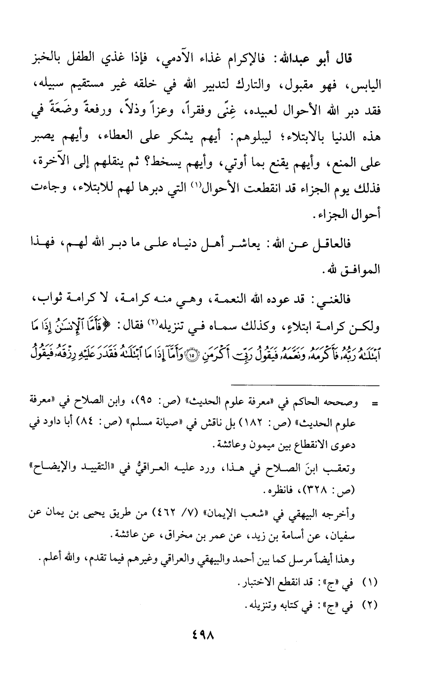 قال أبو عبد الله: فالإكرام غذاء الآدمي، فإذا غذي الطفل بالخبز اليابس، فهو مقبول، والتارك لتدبير الله في خلقه غير مستقيم سبيله، فقد دبر الله الأحوال لعبيده، غنىً وفقراً، وعزاً وذلاً، ورفعةً وضعةً، في هذه الدنيا بالابتلاء؛ ليبلوهم: أيهم يشكر على العطاء، وأيهم يصبر على المنع، وأيهم يقنع بما أوتي، وأيهم يسخط؟ ثم ينقلهم إلى الآخرة، فذلك يوم الجزاء قد انقطعت الأحوال التي دبرها لهم للابتلاء، وجاءت أحوال الجزاء.
