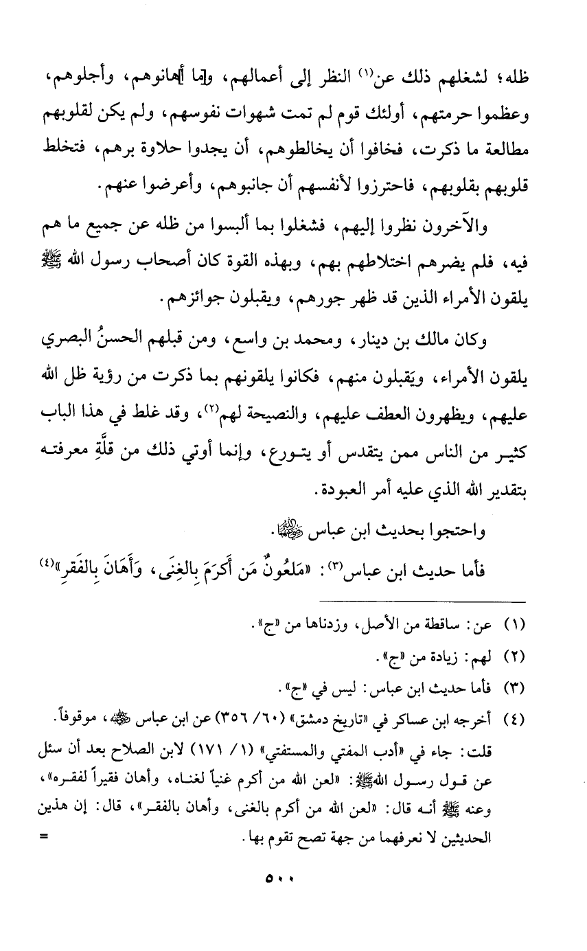 وكان مالك بن دينار، ومحمد بن واسع، ومن قبلهم الحسن البصري يلقون الأمراء، ويقبلون منهم، فكانوا يلقونهم بما ذكرت من رؤية ظل الله عليهم، ويظهرون العطف عليهم، والنصيحة لهم، وقد غلط في هذا الباب كثير من الناس ممن يتقدس أو يتورع، وإنما أوتي ذلك من قلة معرفته بتقدير الله الذي عليه أمر العبودة.