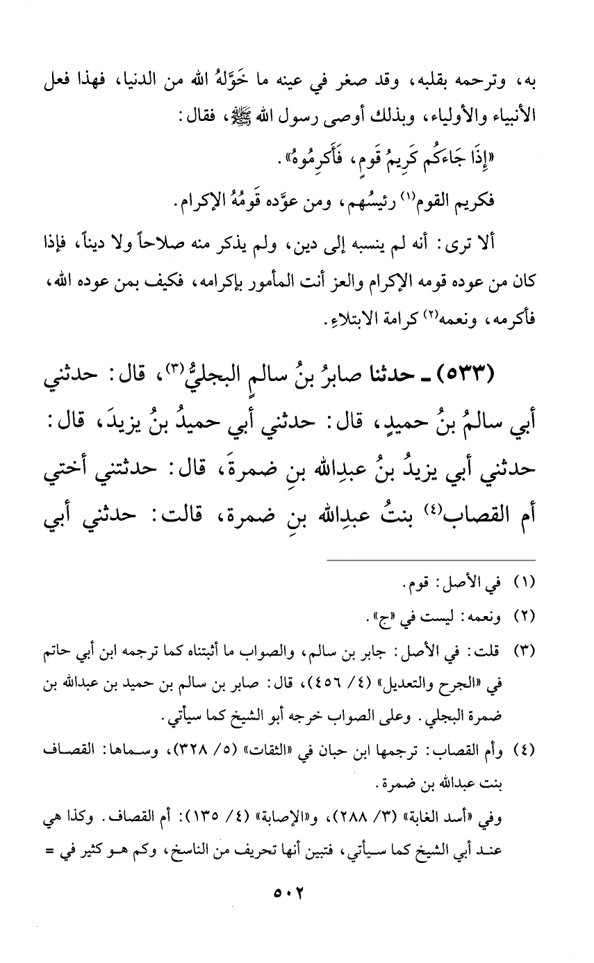 533 - حدثنا صابر بن سالمٍ البجلي، قال: حدثني أبي سالم بن حميدٍ، قال: حدثني أبي حميد بن يزيد، قال: حدثني أبي يزيد بن عبد الله بن ضمرة، قال: حدثتني أختي أم القصاب بنت عبد الله بن ضمرة، قالت: حدثني أبي