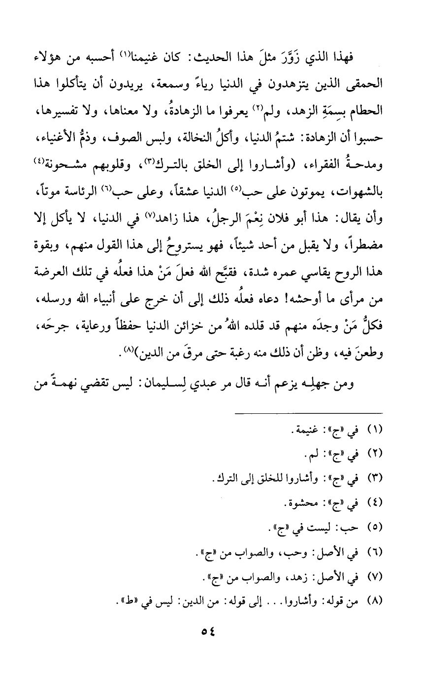 فهذا الذي زور مثل هذا الحديث: كان غنيمنا أحسبه من هؤلاء الحمقى الذين يتزهدون في الدنيا رياءً وسمعة، يريدون أن يتأكلوا هذا الحطام بسمة الزهد، ولم يعرفوا ما الزهادة، ولا معناها، ولا تفسيرها، حسبوا أن الزهادة: شتم الدنيا، وأكل النخالة، ولبس الصوف، وذم الأغنياء، ومدحة الفقراء، (وأشاروا إلى الخلق بالترك، وقلوبهم مشحونة بالشهوات، يموتون على حب الدنيا عشقاً، وعلى حب الرئاسة موتاً، وأن يقال: هذا أبو فلان نعم الرجل، هذا زاهد في الدنيا، لا يأكل إلا مضطراً، ولا يقبل من أحد شيئاً، فهو يستروح إلى هذا القول منهم، وبقوة هذا الروح يقاسي عمره شدة، فقبح الله فعل من هذا فعله في تلك العرضة من مرأى ما أوحشه! دعاه فعله ذلك إلى أن خرج على أنبياء الله ورسله، فكل من وجده منهم قد قلده الله من خزائن الدنيا حفظاً ورعاية، جرحه، وطعن فيه، وظن أن ذلك منه رغبة حتى مرق في الدين).