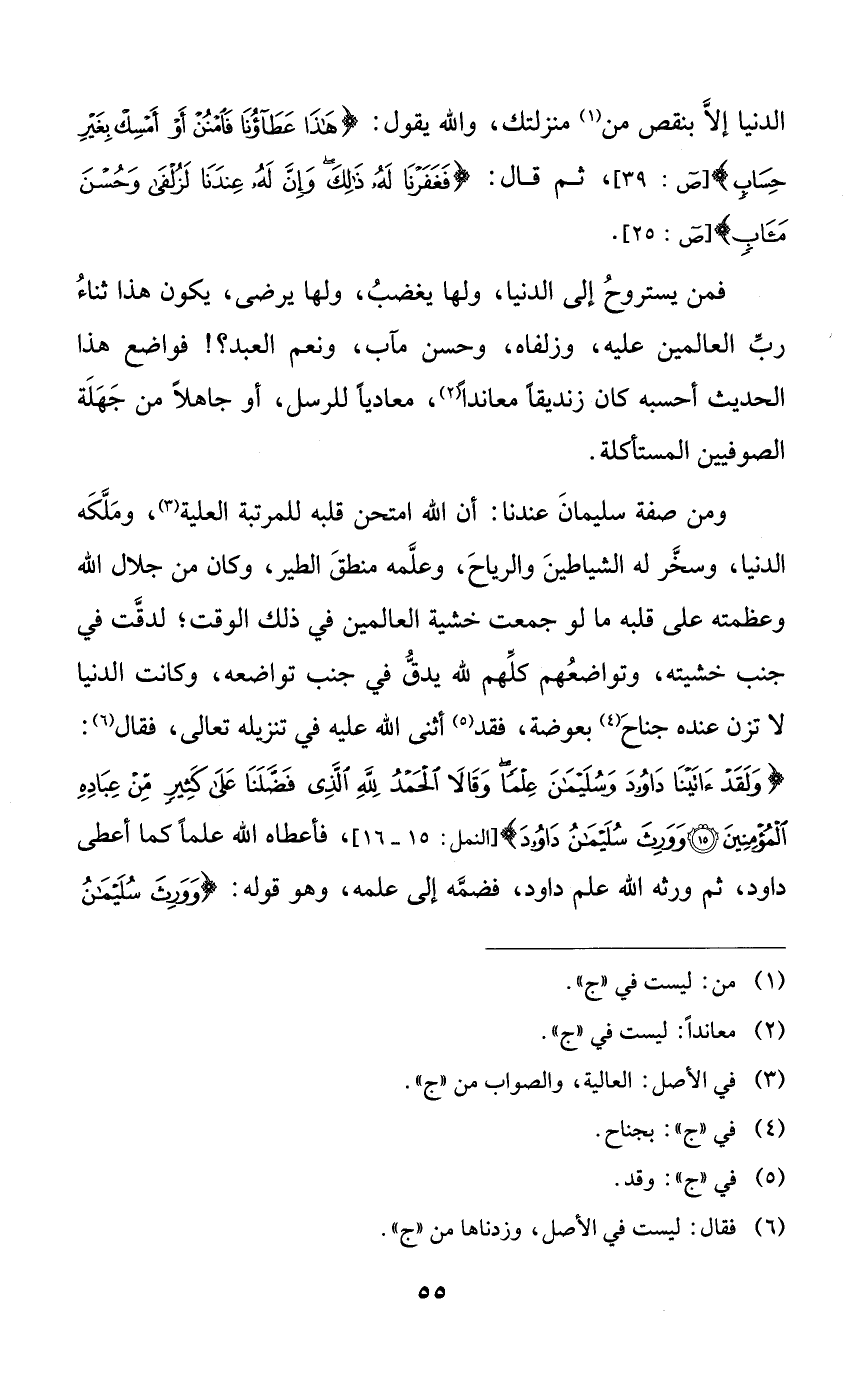 ومن صفة سليمان عندنا: أن الله امتحن قلبه للمرتبة العلية، وملكه الدنيا، وسخر له الشياطين والرياح، وعلمه منطق الطير، وكان من جلال الله وعظمته على قلبه ما لو جمعت خشية العالمين في ذلك الوقت؛ لدقت في جنب خشيته، وتواضعهم كلهم لله يدق في جنب تواضعه، وكانت الدنيا لا تزن عنده جناح بعوضة، فقد أثنى الله عليه في تنزيله تعالى، فقال: {ولقد آيتنا داود وسليمان علماً وقالا الحمد لله الذي فضلنا على كثيرٍ من عباده المؤمنين. وورث سليمان داود}، فأعطاه الله علماً كما أعطى داود، ثم ورثه الله علم داود، فضمه إلى علمه، وهو قوله: {وورث سليمان
