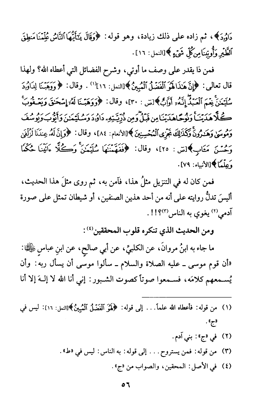 فمن ذا يقدر على وصف ما أوتي، وشرح الفضائل التي أعطاه الله؟ ولهذا قال تعالى: {إن هذا لهو الفضل المبين}. وقال: {ووهبنا لداود سليمان نعم العبد إنه أواب}، وقال: {ووهبنا له إسحاق ويعقوب كلاًّ هدينا ونوحاً هدينا من قبل ومن ذريته داود وسليمان وأيوب ويوسف وموسى وهارون وكذلك نجزي المحسنين}، وقال: {وإن له عندنا لزلفى وحسن مئابٍ}، وقال: {ففهمناها سليمان وكلاًّ آتينا حكماً وعلماً}.