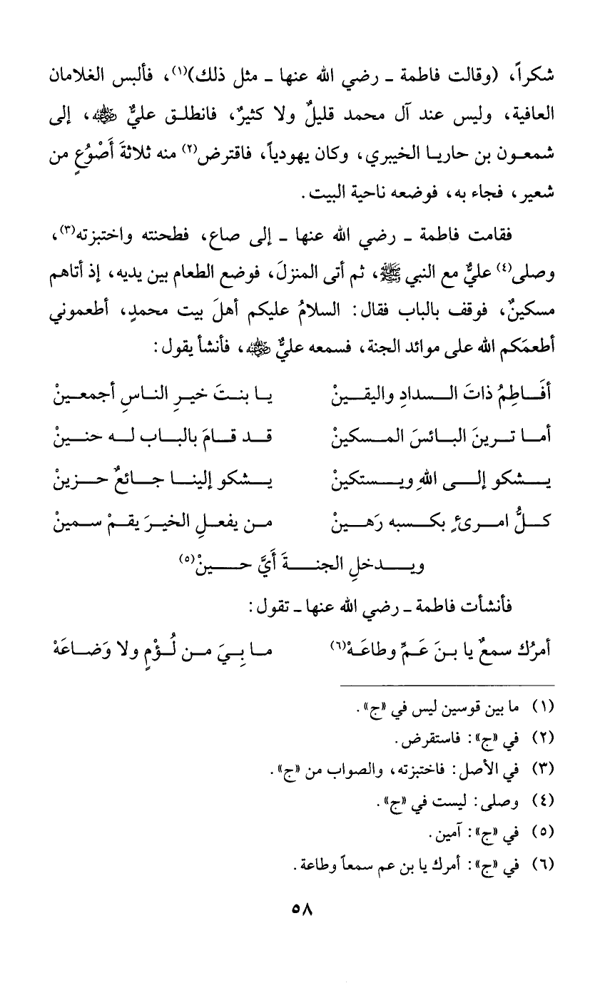 شكراً، (وقالت فاطمة -رضي الله عنها- مثل ذلك)، فألبس الغلامان العافية، وليس عند آل محمد قليلٌ، ولا كثيرٌ، فانطلق عليٌّ رضي الله عنه، إلى شمعون بن حاريا الخيبري، وكان يهودياً، فاقترض منه ثلاثة أصوعٍ من شعير، فجاء به، فوضعه ناحية البيت.