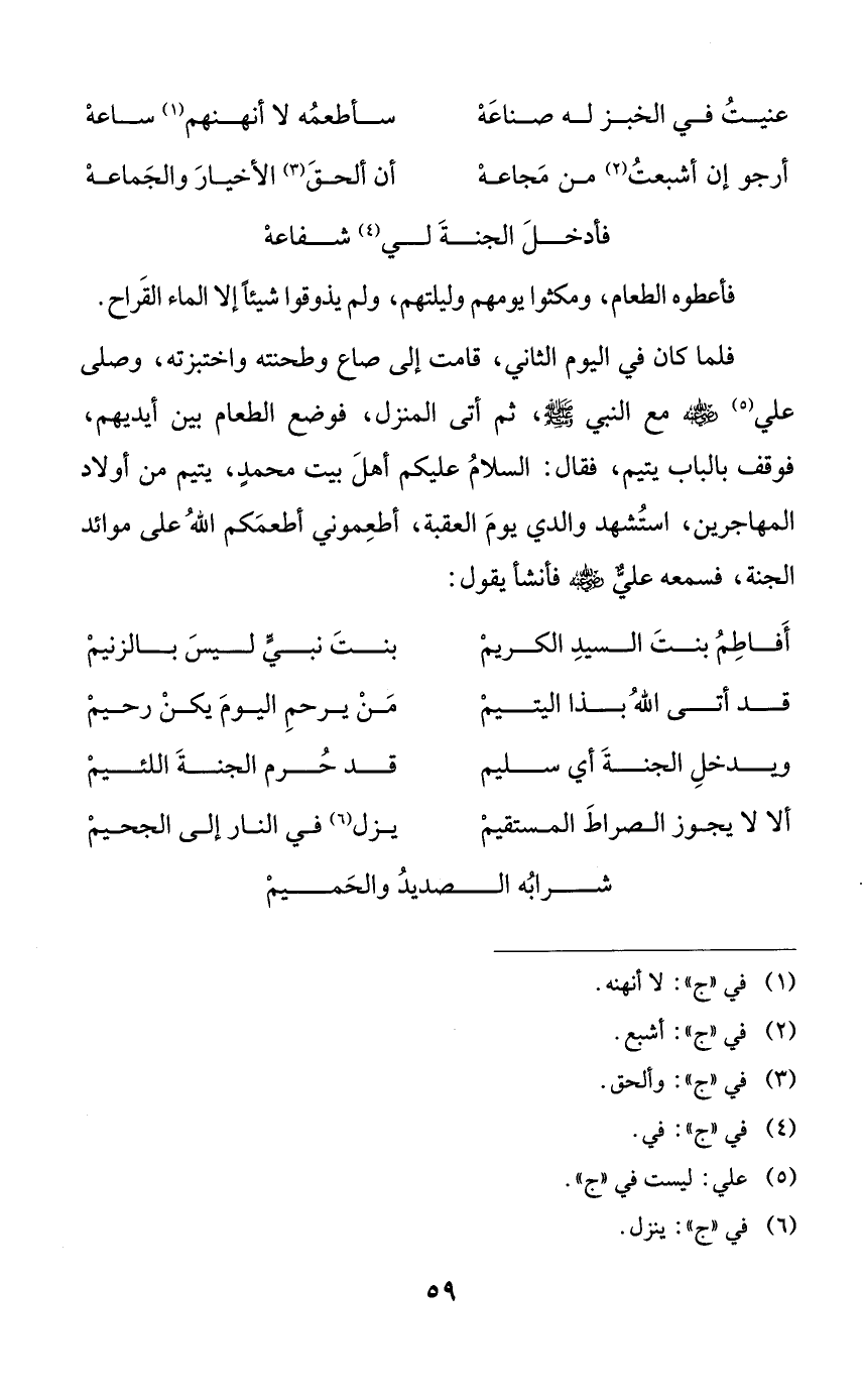 فلما كان في اليوم الثاني، قامت إلى صاع وطحنته واختبزته، وصلى علي رضي الله عنه مع النبي صلى الله عليه وسلم، ثم أتى المنزل، فوضع الطعام بين أيديهم، فوقف بالباب يتيم، فقال: السلام عليكم أهل بيت محمدٍ، يتيم من أولاد المهاجرين، استشهد والدي يوم العقبة، أطعموني أطعمكم الله على موائد الجنة، فسمعه عليٌّ رضي الله عنه فأنشأ يقول: