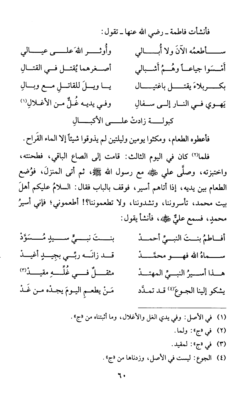 فلما كان في اليوم الثالث: قامت إلى الصاع الباقي، فطحنته، واختبزته، وصلى علي رضي الله عنه مع رسول الله صلى الله عليه وسلم، ثم أتى المنزل، فوضع الطعام بين يديه، إذا أتاهم أسير، فوقف بالباب فقال: السلام عليكم أهل بيت محمد، تأسروننا، وتشدوننا، ولا تطعموننا؟! أطعموني؛ فإني أسير محمدٍ، فسمع عليٌّ رضي الله عنه، فأنشأ يقول:
