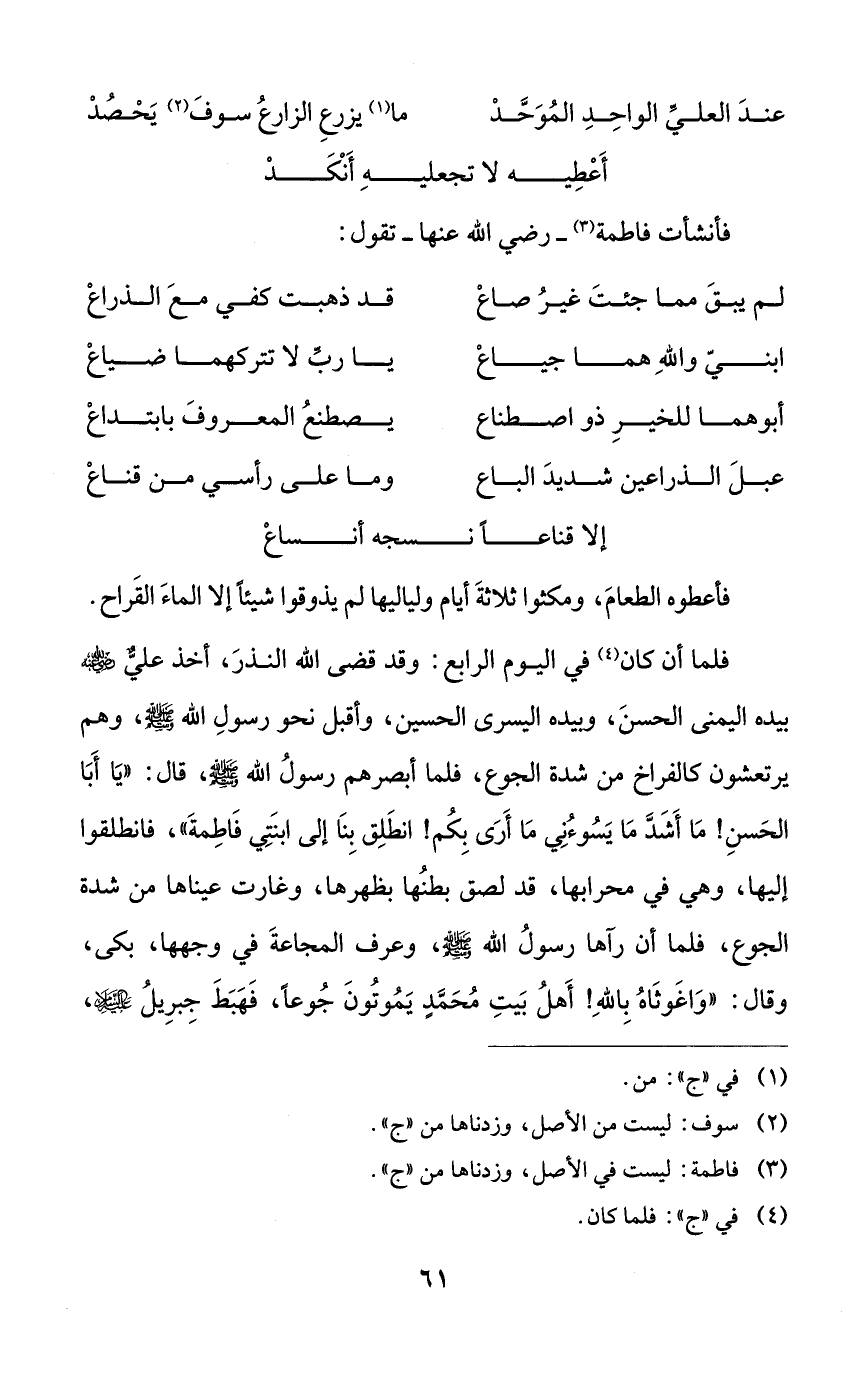 فلما أن كان في اليوم الرابع: وقد قضى الله النذر، أخذ عليٌّ رضي الله عنه بيده اليمنى الحسن، وبيده اليسرى الحسين، وأقبل نحو رسول الله صلى الله عليه وسلم، وهم يرتعشون كالفراخ من شدة الجوع، فلما أبصرهم رسول الله صلى الله عليه وسلم، قال: ((يا أبا الحسن! ما أشد ما يسوءني ما أرى بكم! انطلق بنا إلى ابنتي فاطمة))، فانطلقوا إليها، وهي في محرابها، قد لصق بطنها بظهرها، وغارت عيناها من شدة الجوع، فلما أن رآها رسول الله صلى الله عليه وسلم، وعرف المجاعة في وجهها، بكى، وقال: ((واغوثاه بالله! أهل بيت محمدٍ يموتون جوعاً، فهبط جبريل عليه السلام،