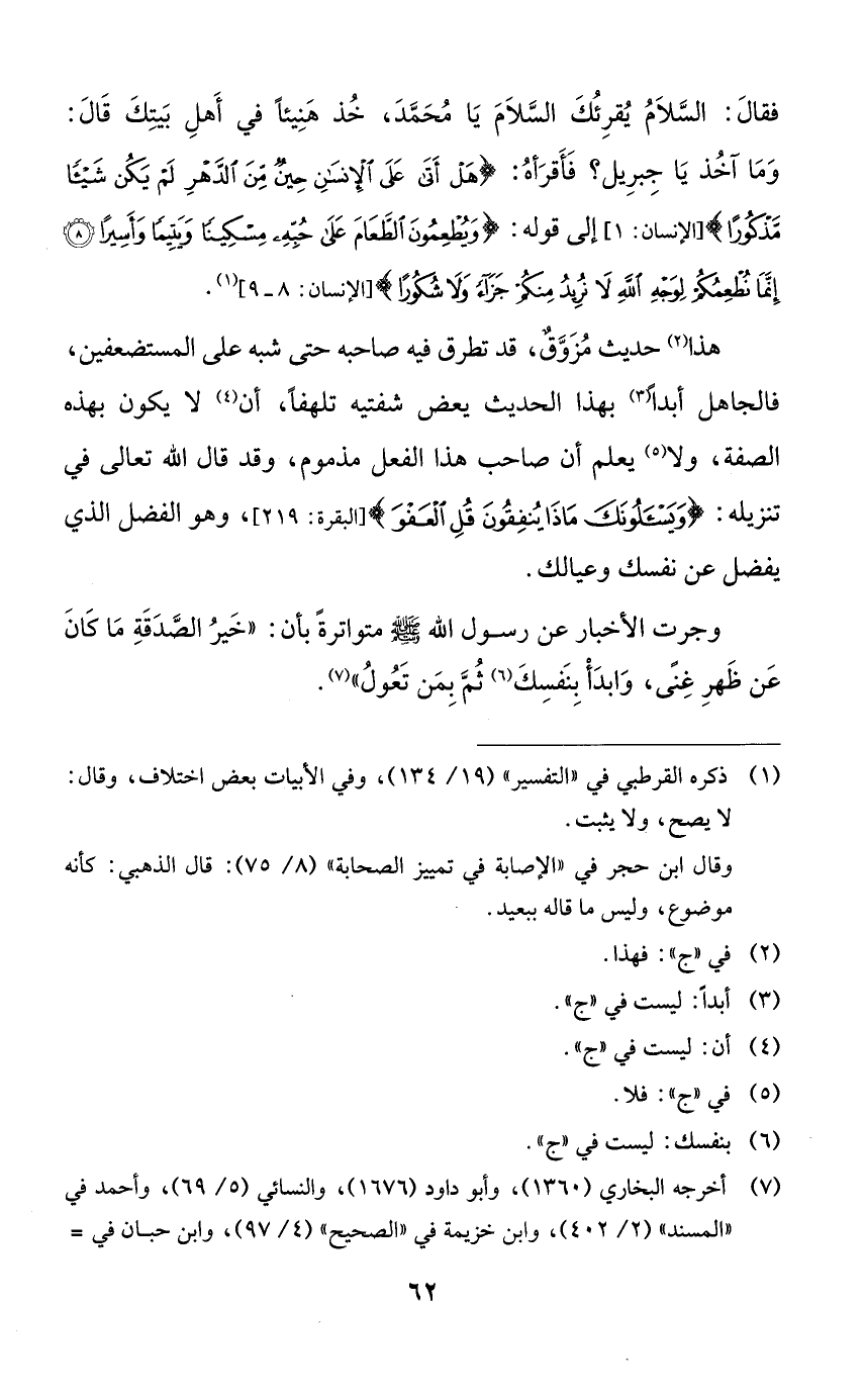 هذا حديث مزوقٌ، قد تطرق فيه صاحبه حتى شبه على المستضعفين، فالجاهل أبداً بهذا الحديث يعض شفتيه تلهفاً، أن لا يكون بهذه الصفة، ولا يعلم أن صاحب هذا الفعل مذموم، وقد قال الله تعالى في تنزيله: {ويسئلونك ماذا ينفقون قل العفو}، وهو الفضل الذي يفضل عن نفسك وعيالك.