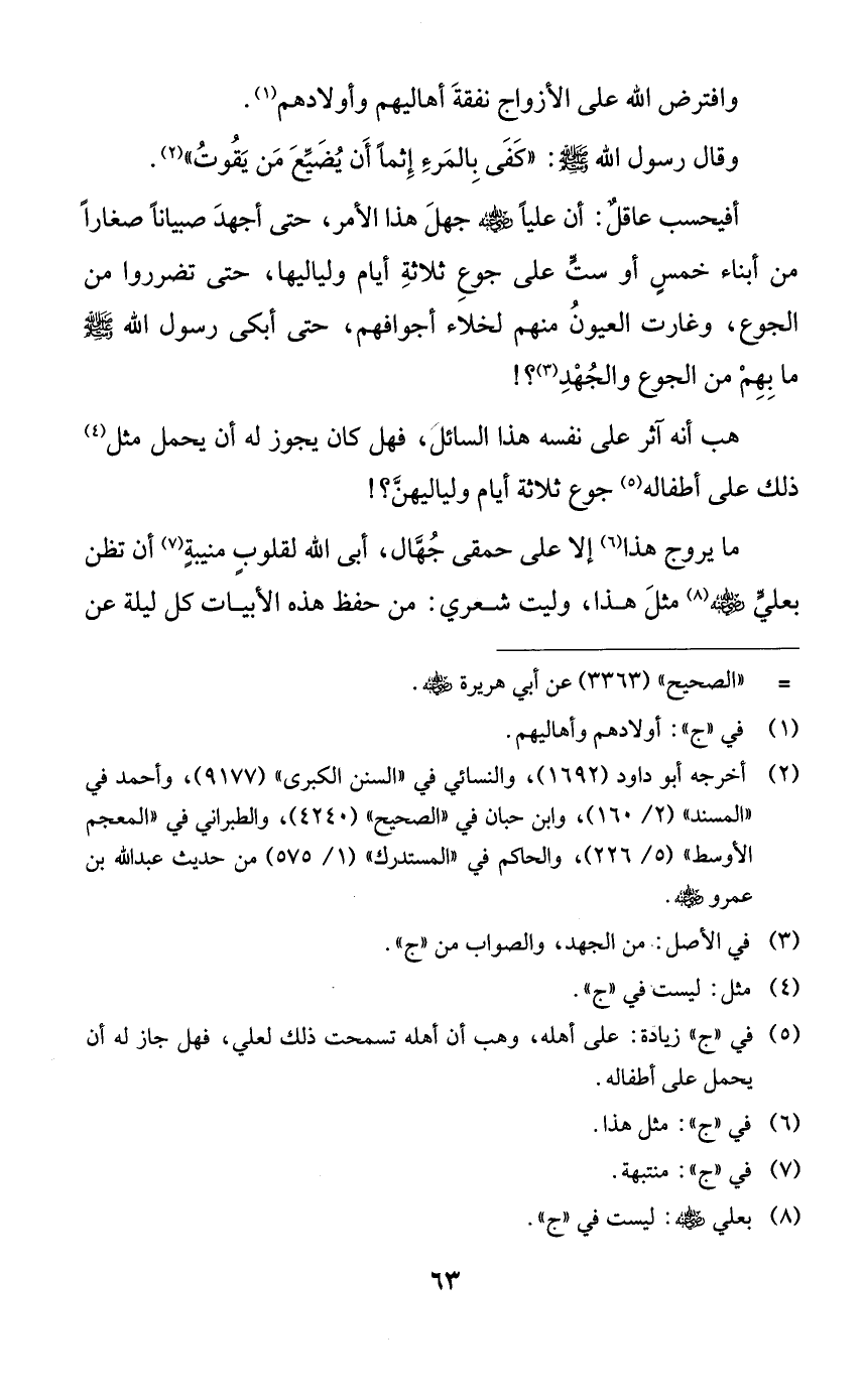 أفيحسب عاقلٌ: أن علياً رضي الله عنه جهل هذا الأمر، حتى أجهد صبياناً صغاراً من أبناء خمسٍ أو ستٍّ على جوع ثلاثة أيام ولياليها، حتى تضرروا من الجوع، وغارت العيون منهم لخلاء أجوافهم، حتى أبكى رسول الله صلى الله عليه وسلم ما بهم من الجوع والجهد؟!