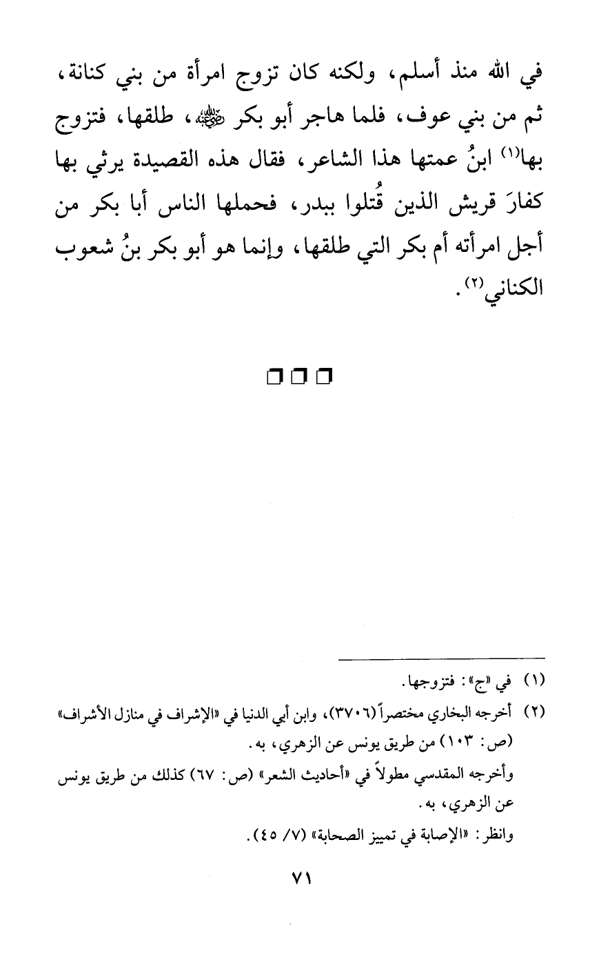 في الله منذ أسلم، ولكنه كان تزوج امرأة من بني كنانة، ثم من بني عوف، فلما هاجر أبو بكر رضي الله عنه، طلقها، فتزوج بها ابن عمتها هذا الشاعر، فقال هذه القصيدة يرثي بها كفار قريش الذين قتلوا ببدر، فحملها الناس أبا بكر من أجل امرأته أم بكر التي طلقها، وإنما هو أبو بكر بن شعوب الكناني.