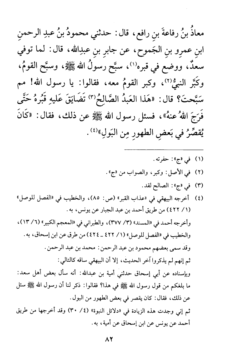 معاذ بن رفاعة بن رافع، قال: حدثني محمود بن عبد الرحمن ابن عمرو بن الجموح، عن جابر بن عبد الله، قال: لما توفي سعدٌ، ووضع في قبره، سبح رسول الله صلى الله عليه وسلم، وسبح القوم، وكبر النبي، وكبر القوم معه، فقالوا: يا رسول الله! مم سبحت؟ قال: ((هذا العبد الصالح تضايق عليه قبره حتى فرج الله عنه))، فسئل رسول الله صلى الله عليه وسلم عن ذلك، فقال: ((كان يقصر في بعض الطهور من البول)).