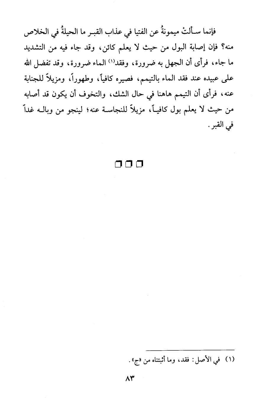 فإنما سألت ميمونة عن الفتيا في عذاب القبر ما الحيلة في الخلاص منه؟ فإن إصابه البول من حيث لا يعلم كائن، وقد جاء فيه من التشديد ما جاء، فرأى أن الجهل به ضرورة، وفقد الماء ضرورة، وقد تفضل الله على عبيده عند فقد الماء بالتيمم، فصيره كافياً، وطهوراً، ومزيلاً للجنابة عنه، فرأى أن التيمم هاهنا في حال الشك، والتخوف أن يكون قد أصابه من حيث لا يعلم بول كافياً، مزيلاً للنجاسة عنه؛ لينجو من وباله غداً في القبر.