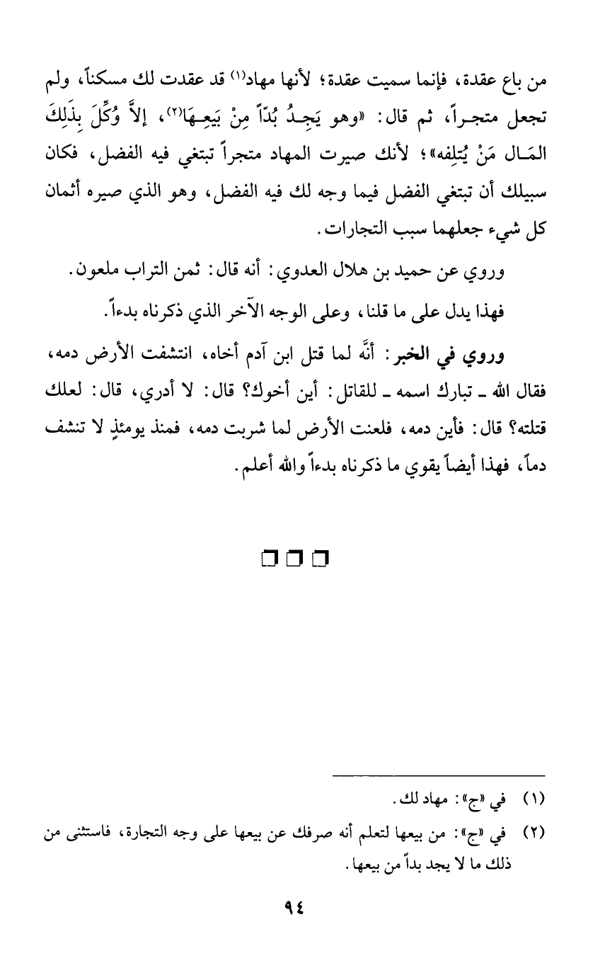 من باع عقدة، فإنما سميت عقدة؛ لأنها مهاد قد عقدت لك مسكناً، ولم تجعل متجراً، ثم قال: ((وهو يجد بداً من بيعها، إلا وكل بذلك المال من يتلفه))؛ لأنك صيرت المهاد متجراً تبتغي فيه الفضل، فكان سبيلك أن تبتغي الفضل فيما وجه لك فيه الفضل، وهو الذي صيره أثمان كل شيء جعلهما سبب التجارات.