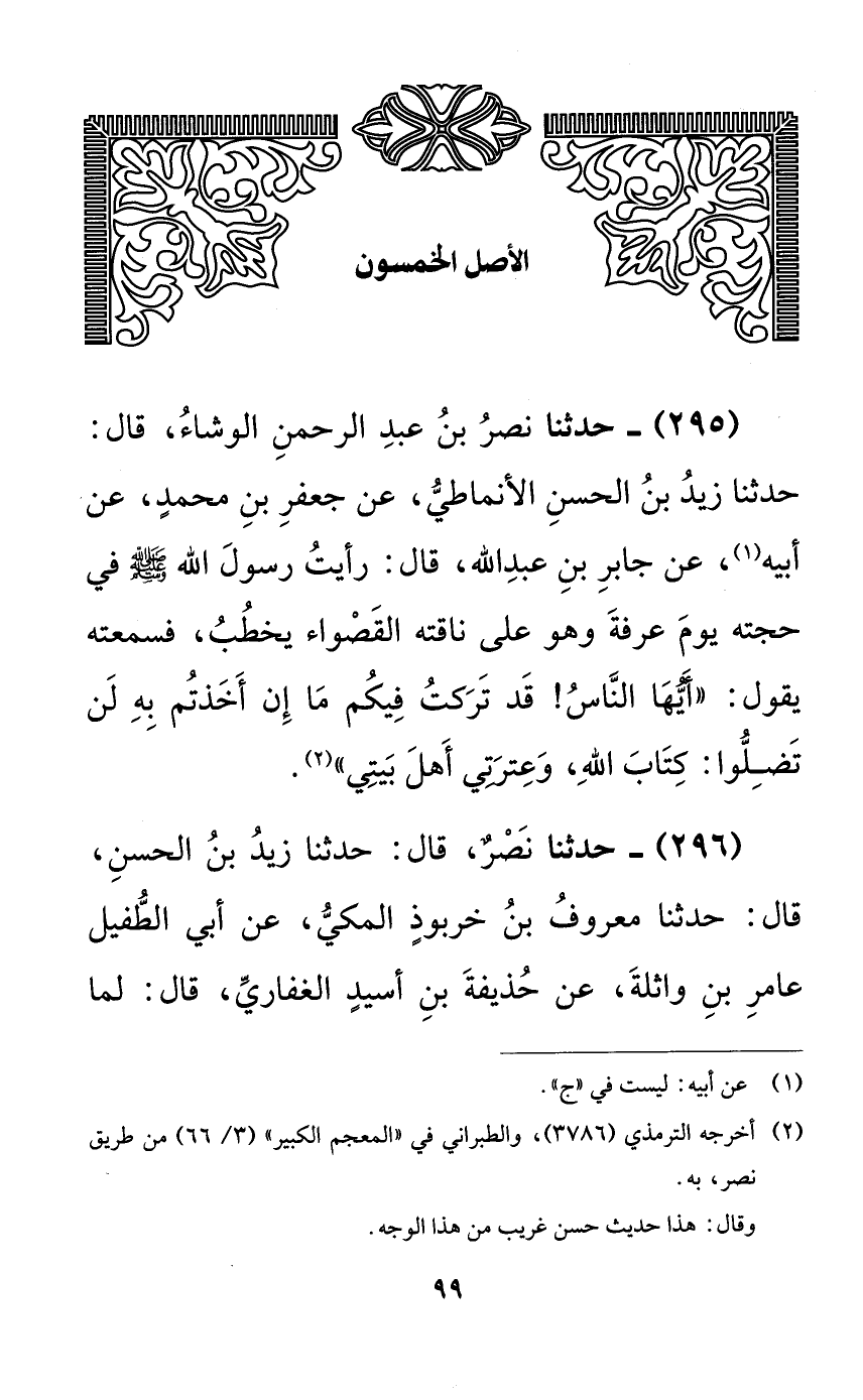295 - حدثنا نصر بن عبد الرحمن الوشاء، قال: حدثنا زيد بن الحسن الأنماطي، عن جعفر بن محمدٍ، عن أبيه، عن جابر بن عبد الله، قال: رأيت رسول الله صلى الله عليه وسلم في حجته يوم عرفة وهو على ناقته القصواء يخطب، فسمعته يقول: ((أيها الناس! قد تركت فيكم ما إن أخذتم به لن تضلوا: كتاب الله، وعترتي أهل بيتي)).