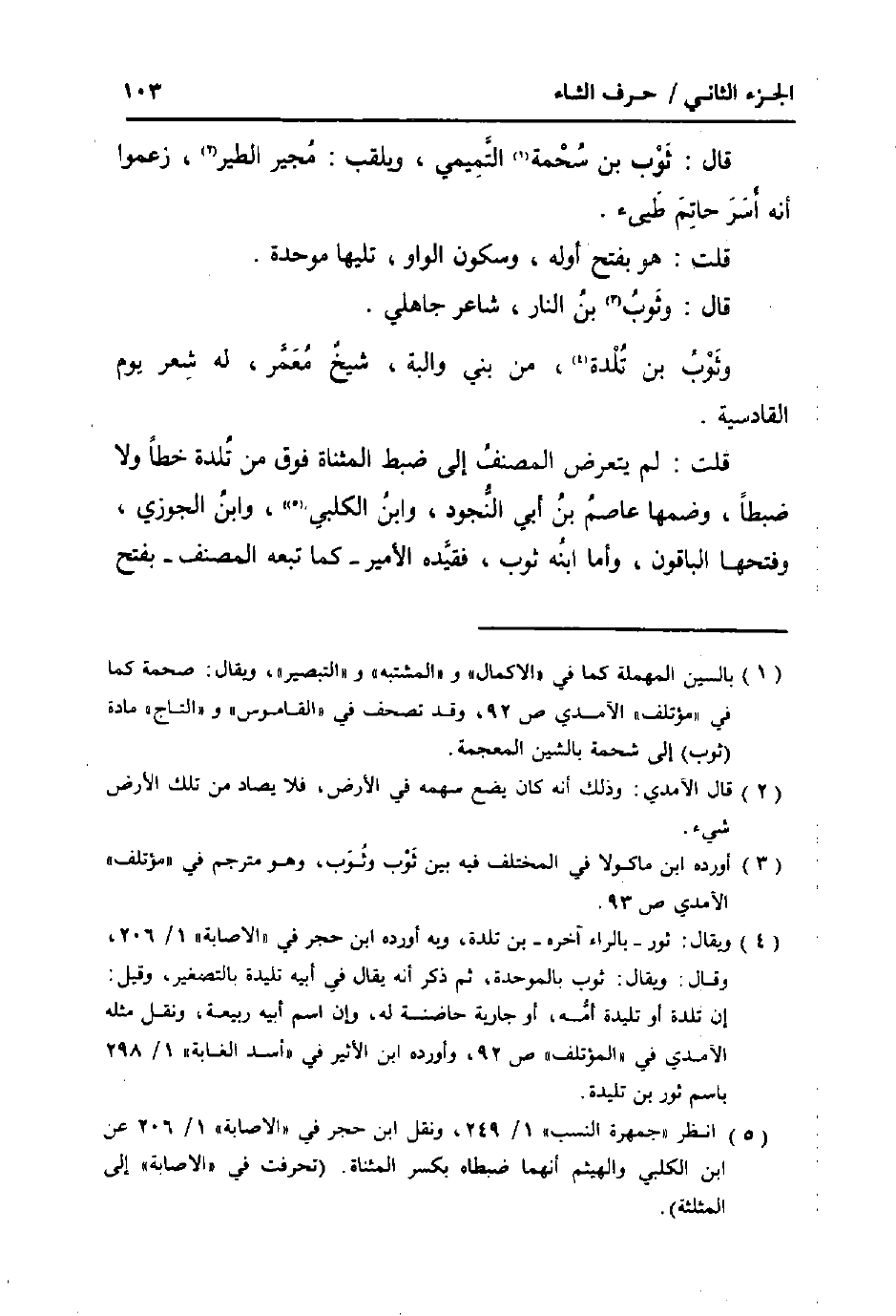 قلت: لم يتَعَرَّض المُصَنّف إِلَى ضبط الْمُثَنَّاة فَوق من تلدة خطأ وَلَا ضبطا، وَضمّهَا عَاصِم بن أبي النجُود، وَابْن الْكَلْبِيّ، وَابْن الْجَوْزِيّ، وَفتحهَا الْبَاقُونَ، وَأما ابْنه ثوب، فقيده الْأَمِير - كَمَا تبعه المُصَنّف - بِفَتْح
