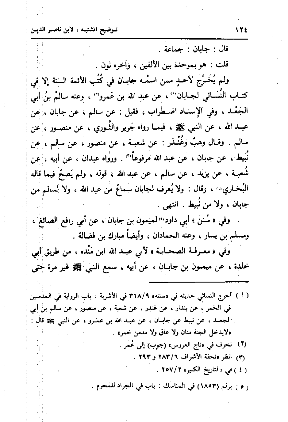 وَلم يخرج لأحد مِمَّن اسْمه جَابَان فِي كتب الائمة السِّتَّة إِلَّا فِي كتاب النَّسَائِيّ لجابان، عَن عبد الله بن عَمْرو، وَعنهُ سَالم بن أبي الْجَعْد، وَفِي الْإِسْنَاد اضْطِرَاب، فَقيل: عَن سَالم، عَن جَابَان، عَن عبد الله، عَن النَّبِي صلى الله عَلَيْهِ وَسلم، فِيمَا رَوَاهُ جرير وَالثَّوْري، عَن مَنْصُور، عَن سَالم. وَقَالَ وهب وغندر: عَن شُعْبَة، عَن مَنْصُور، عَن سَالم، عَن نبيط، عَن جَابَان، عَن عبد الله مَرْفُوعا، وَرَوَاهُ عَبْدَانِ، عَن ابيه، عَن شُعْبَة، عَن يزِيد، عَن سَالم، عَن عبد الله، قَوْله، وَلم يَصح فِيمَا قَالَه البُخَارِيّ، وَقَالَ: وَلَا يعرف لجابان سَماع من عبد الله، وَلَا لسالم من جَابَان، وَلَا من نبيط. انْتهى.