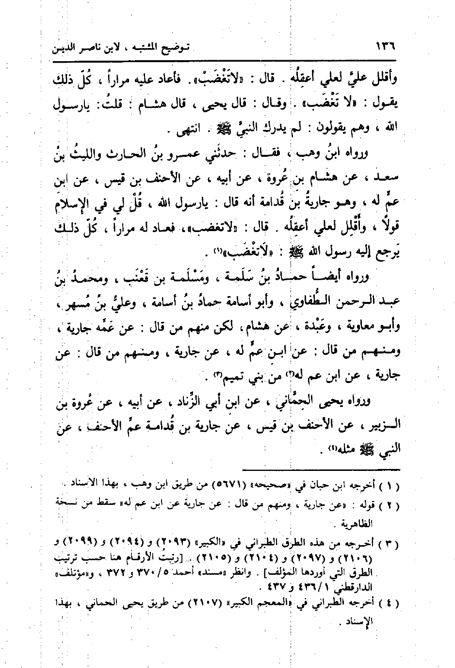 وَرَوَاهُ ابْن وهب، فَقَالَ: حَدثنِي عَمْرو بن الْحَارِث وَاللَّيْث بن سعد، عَن هِشَام بن عُرْوَة، عَن ابيه، عَن الْأَحْنَف بن قيس، عَن ابْن عَم لَهُ، وَهُوَ جَارِيَة بن قدامَة انه قَالَ: يَا رَسُول الله، قل لي فِي الْإِسْلَام قولا، وأقلل لعَلي اعقله. قَالَ: " لَا تغْضب "، فَعَاد لَهُ مرَارًا، كل ذَلِك يرجع إِلَيْهِ رَسُول الله صلى الله عَلَيْهِ وَسلم: لَا تغْضب ".