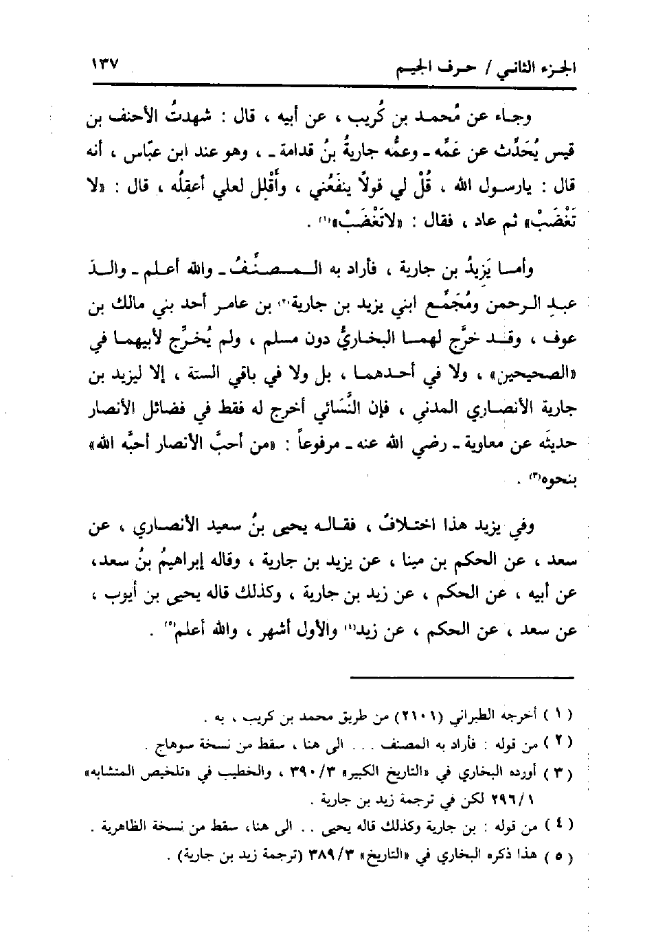 وَجَاء عَن مُحَمَّد بن كريب، عَن ابيه، قَالَ: شهِدت الْأَحْنَف بن قيس يحدث عَن عَمه - وَعَمه جَارِيَة بن قدامَة -، وَهُوَ عِنْد ابْن عَبَّاس، انه قَالَ: يَا رَسُول الله، قل لي قولا يَنْفَعنِي، وأقلل لعَلي أعقله، قَالَ: " لَا تغْضب " ثمَّ عَاد، فَقَالَ: " لَا تغْضب ".