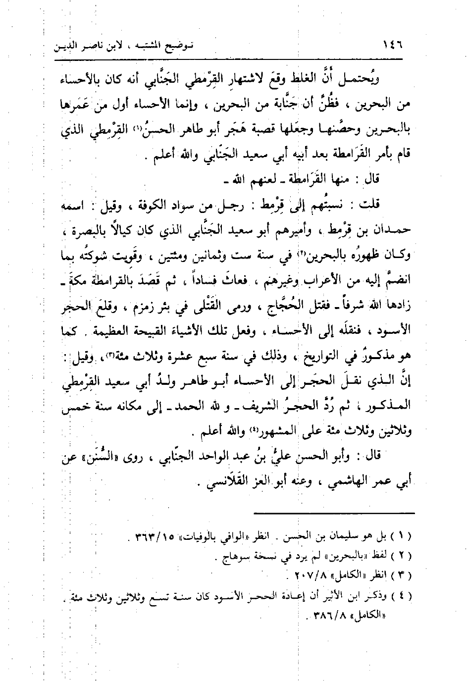 قلت: نسبتهم إِلَى قرمط: رجل من سَواد الْكُوفَة، وَقيل: اسْمه حمدَان بن قرمط، وأميرهم أَبُو سعيد الجنابي الَّذِي كَانَ كيالا بِالْبَصْرَةِ، وَكَانَ ظُهُوره بِالْبَحْرَيْنِ فِي سنة سِتّ وَثَمَانِينَ ومئتين، وقويت شوكته بِمَا انْضَمَّ إِلَيْهِ من الاعراب وَغَيرهم، فعاث فَسَادًا، ثمَّ قصد بالقرامطة مَكَّة - زَادهَا الله شرفا - فَقتل الْحجَّاج، وَرمى الْقَتْلَى فِي بِئْر زَمْزَم، وَقلع الْحجر الاسود، فنقله إِلَى الإحساء، وَفعل تِلْكَ الْأَشْيَاء القبيحة الْعَظِيمَة. كَمَا هُوَ مَذْكُور فِي التواريخ، وَذَلِكَ فِي سنة سبع عشرَة وَثَلَاث مئة، وَقيل: إِن الَّذِي نقل الْحجر إِلَى الاحساء أَبُو طَاهِر ولد أبي سعيد القرمطي الْمَذْكُور، ثمَّ رد الْحجر الشريف - وَللَّه الْحَمد - إِلَى مَكَانَهُ سنة خمس وَثَلَاثِينَ وَثَلَاث مئة على الْمَشْهُور وَالله أعلم.