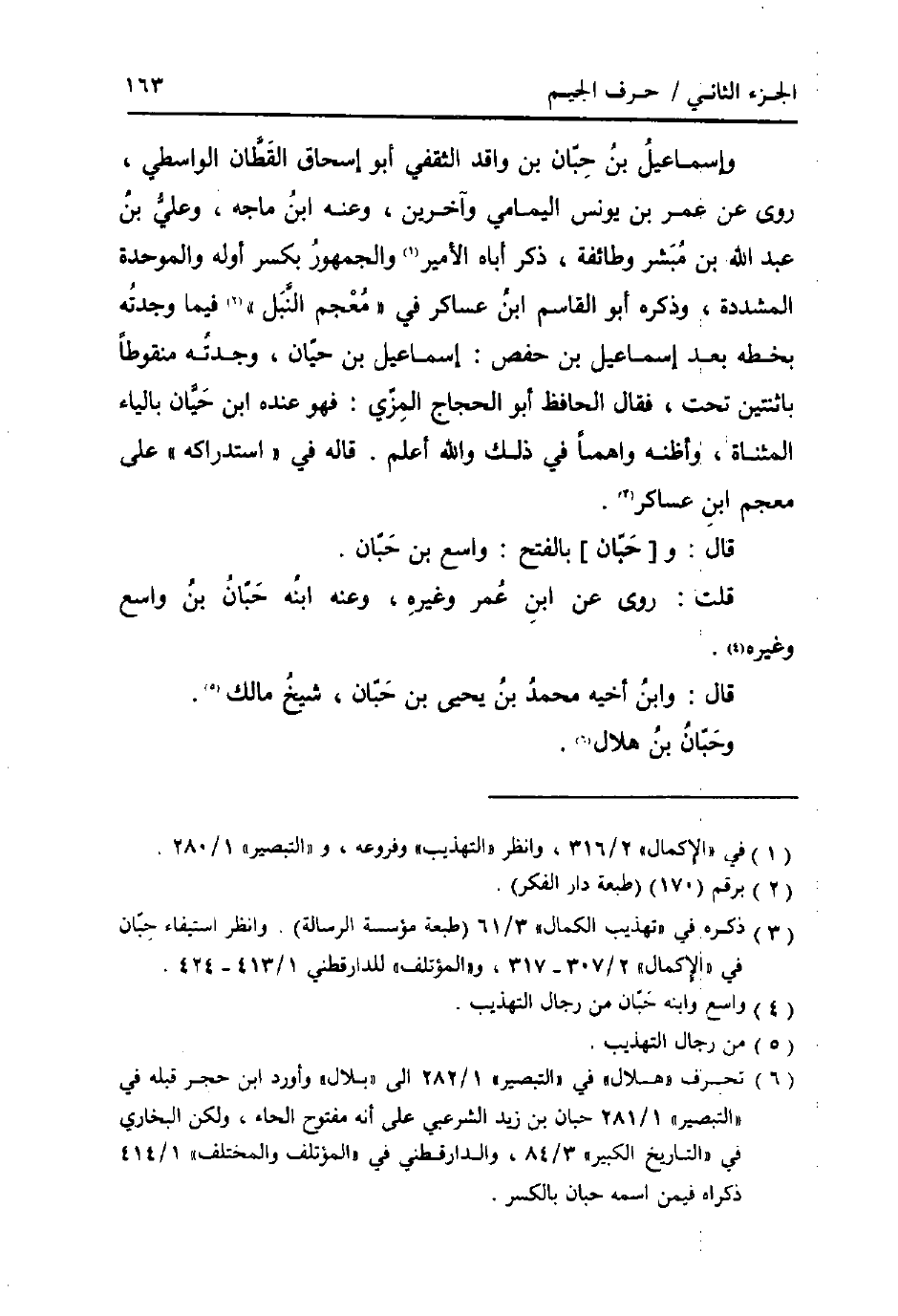 وَإِسْمَاعِيل بن حبَان بن وَاقد الثَّقَفِيّ أَبُو إِسْحَاق الْقطَّان الوَاسِطِيّ، روى عَن عمر بن يُونُس اليمامي وَآخَرين، وَعنهُ بَان مَاجَه، وَعلي بن عبد الله بن مُبشر وَطَائِفَة، ذكر أَبَاهُ الْأَمِير وَالْجُمْهُور بِكَسْر أَوله وَالْمُوَحَّدَة الْمُشَدّدَة، وَذكر أَبُو الْقَاسِم ابْن عَسَاكِر فِي " مُعْجم النبل " فِيمَا وجدته بِخَطِّهِ بعد إِسْمَاعِيل بن حَفْص: إِسْمَاعِيل بن حَيَّان، وجدته منقوطا بِاثْنَتَيْنِ تَحت، فَقَالَ الْحَافِظ أَبُو الْحجَّاج الْمزي: فَهُوَ عِنْده ابْن حَيَّان بِالْيَاءِ الْمُثَنَّاة، واظنه واهما فِي ذَلِك وَالله أعلم. قَالَه فِي " استدراكه " على مُعْجم ابْن عَسَاكِر.